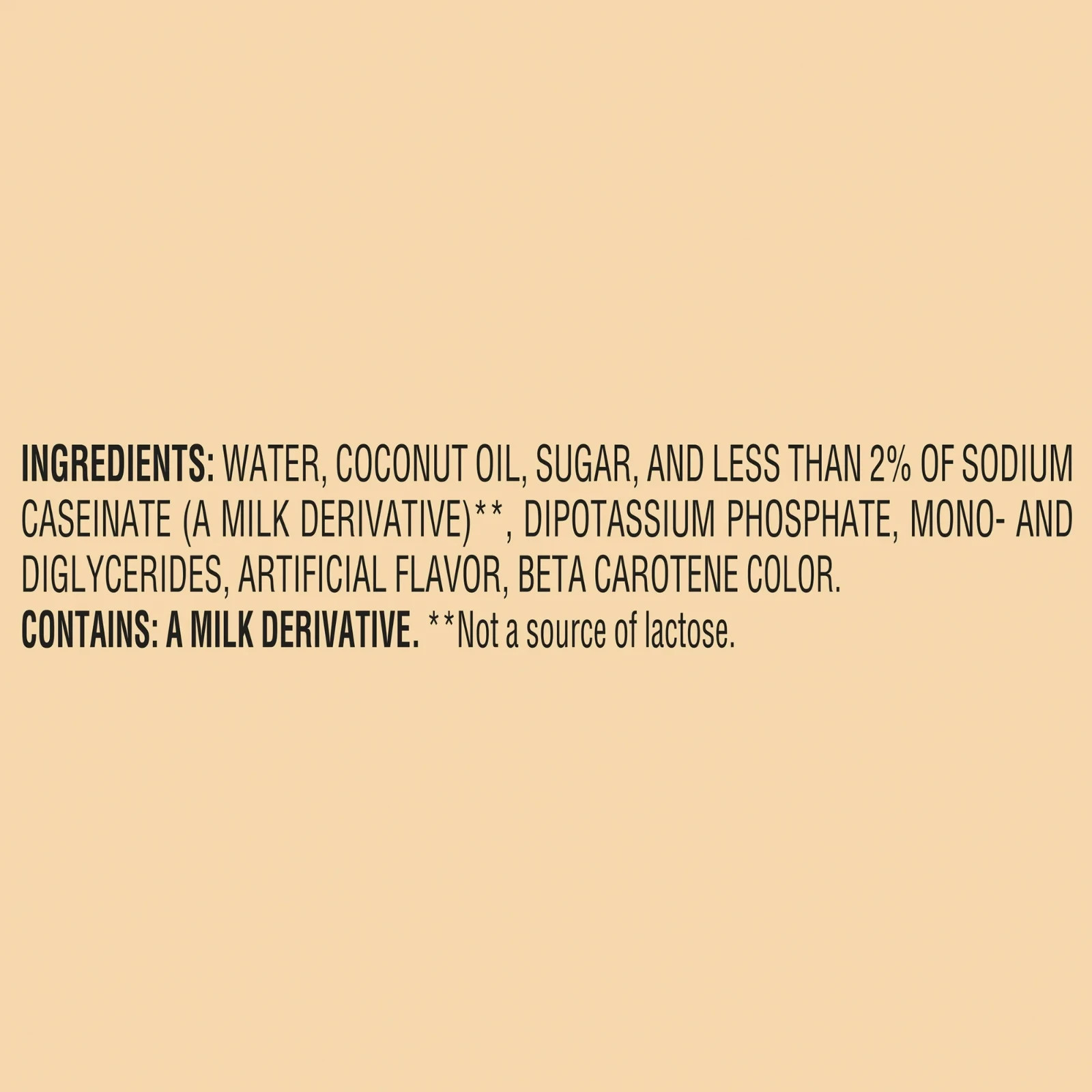 water, coconut oil, sugar, and less than 2% of sodium CASEINATE (a MILK derivative)**, dipotassium phosphate, mono- and diglycerides, artificial flavor, beta carotene color.
