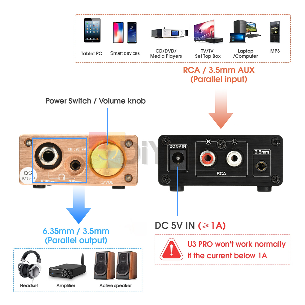 Xz-U301Pro DC5V Class A Hi-Fi Linear Headphone Amplifier 6.35/ 3.5mm Jack RCA