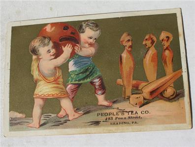 Here is a great Vintage Bowling Trade Card from People's Tea Company Reading Pennsylvania with 2 babies holding a Big Bowling Ball with face and head people carved Bowling Pins Trade Card . It is Awesome. Good Condition-SEE ALL PHOTOS. It measures about 3 inches tall when open by about 4 1/2 inches wide. Grab this great Collectible while you still can it will not last long.