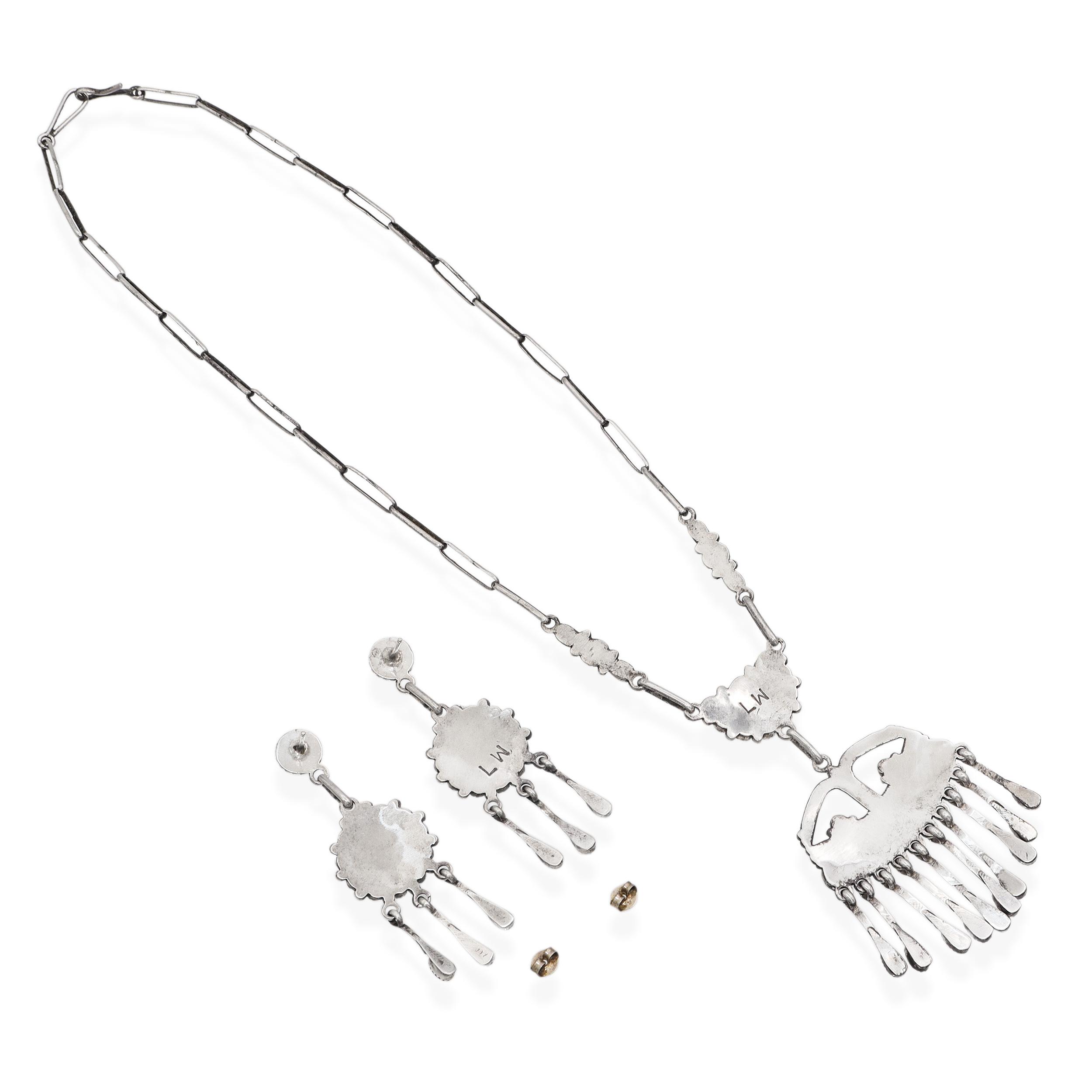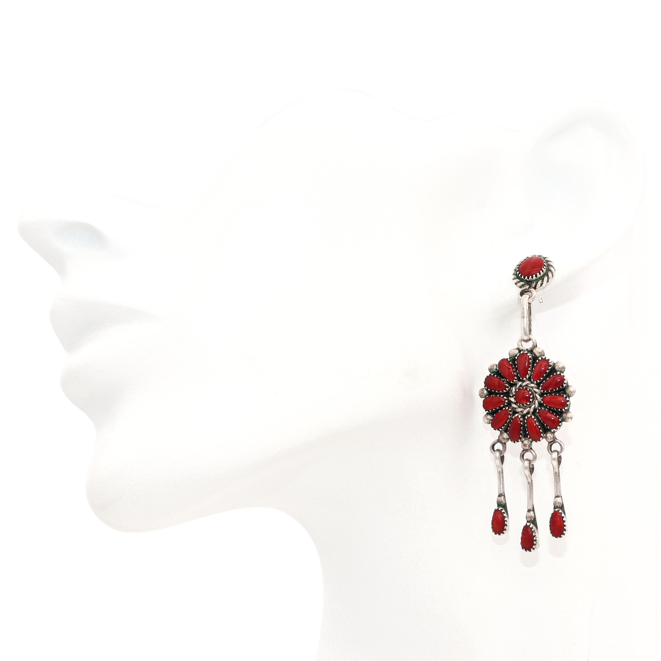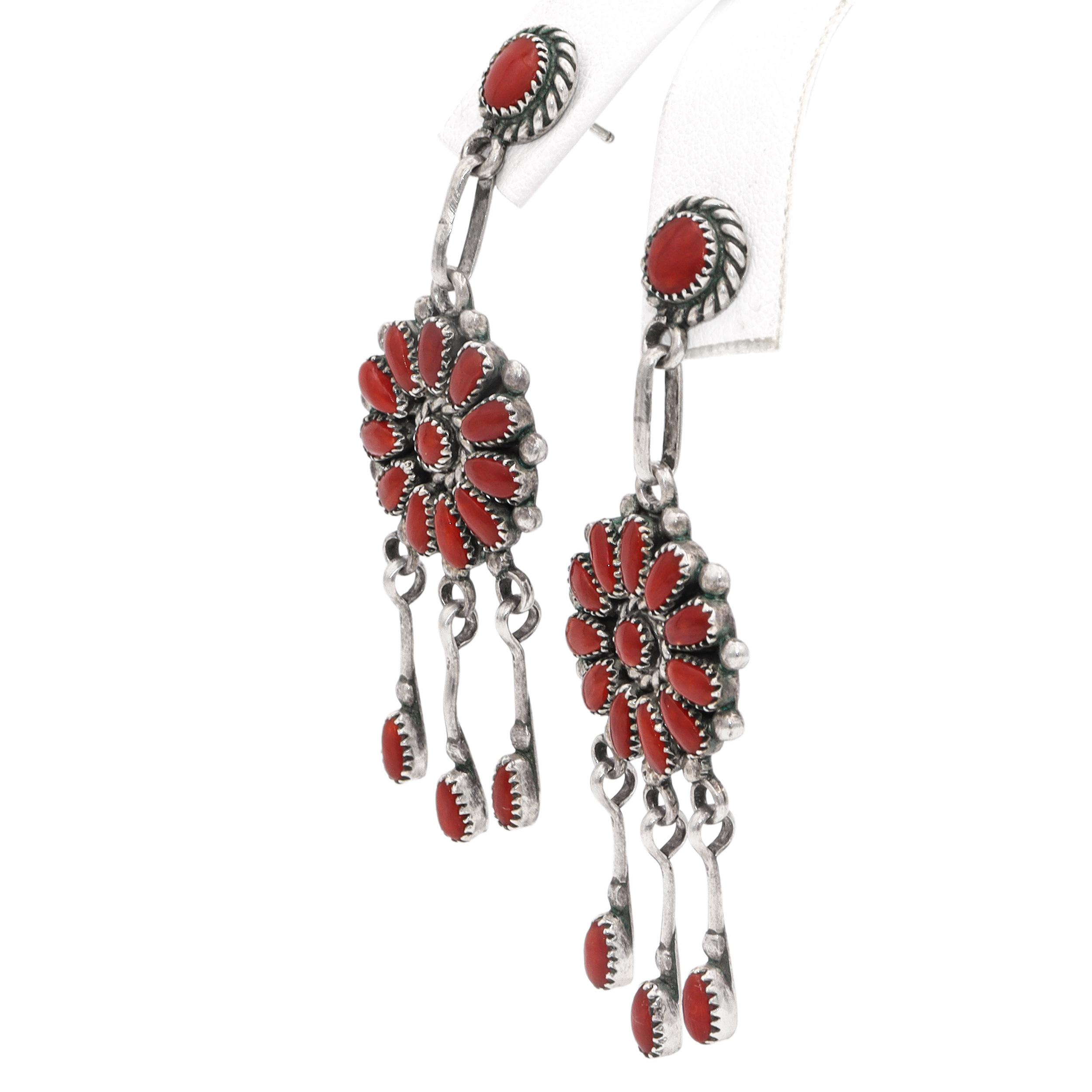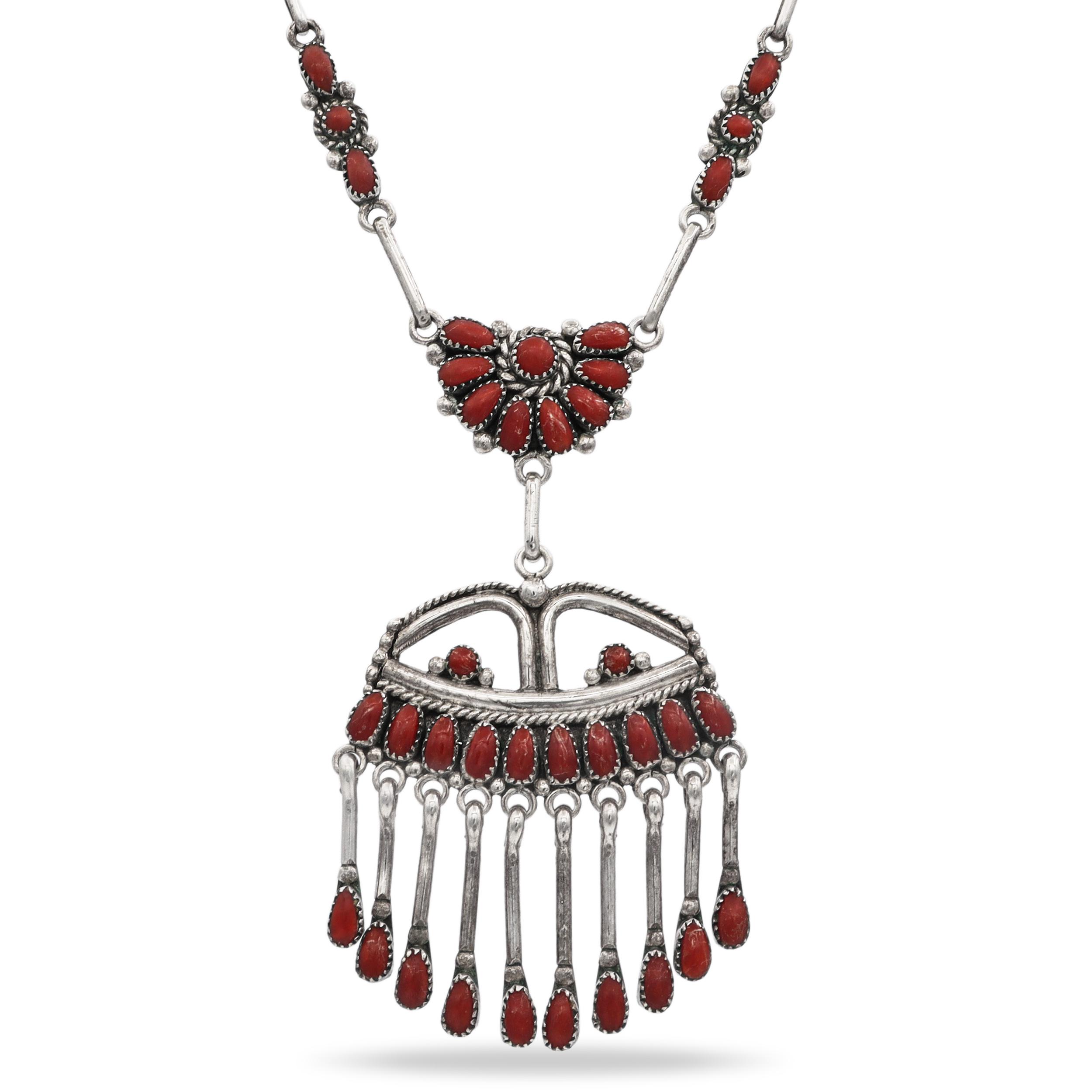 This striking vintage Native American jewelry set by Lorraine Waatsa includes a handcrafted sterling silver necklace and matching dangle earrings, each set with natural red coral cabochons. The necklace features an intricate cluster design at the center, suspending a large pendant with cascading coral drops that create bold movement and dramatic visual impact. The matching earrings echo the cluster motif with radiating coral cabochons and dangling teardrop coral accents, completing the coordinated look. Each piece is meticulously crafted in traditional Navajo silverwork, showcasing classic rope and bead detailing around the stones. A vibrant, highly collectible set that celebrates Native American artistry, ideal for statement wear or for collectors of fine Southwestern jewelry.