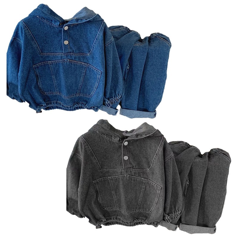 Toddler Baby Boys Denim Outfits Long Sleeve Drawstring Hem Hooded Tops with Pant