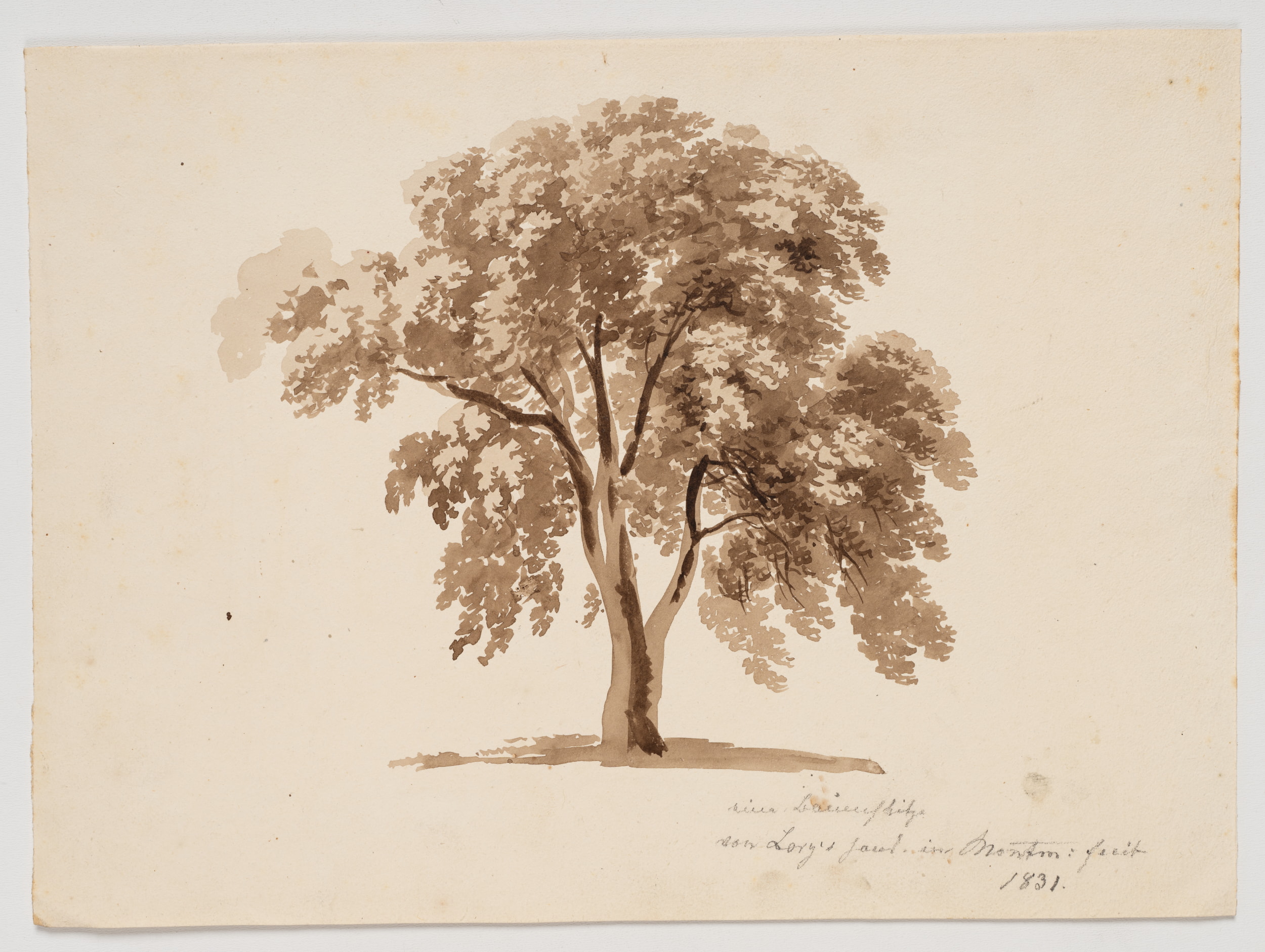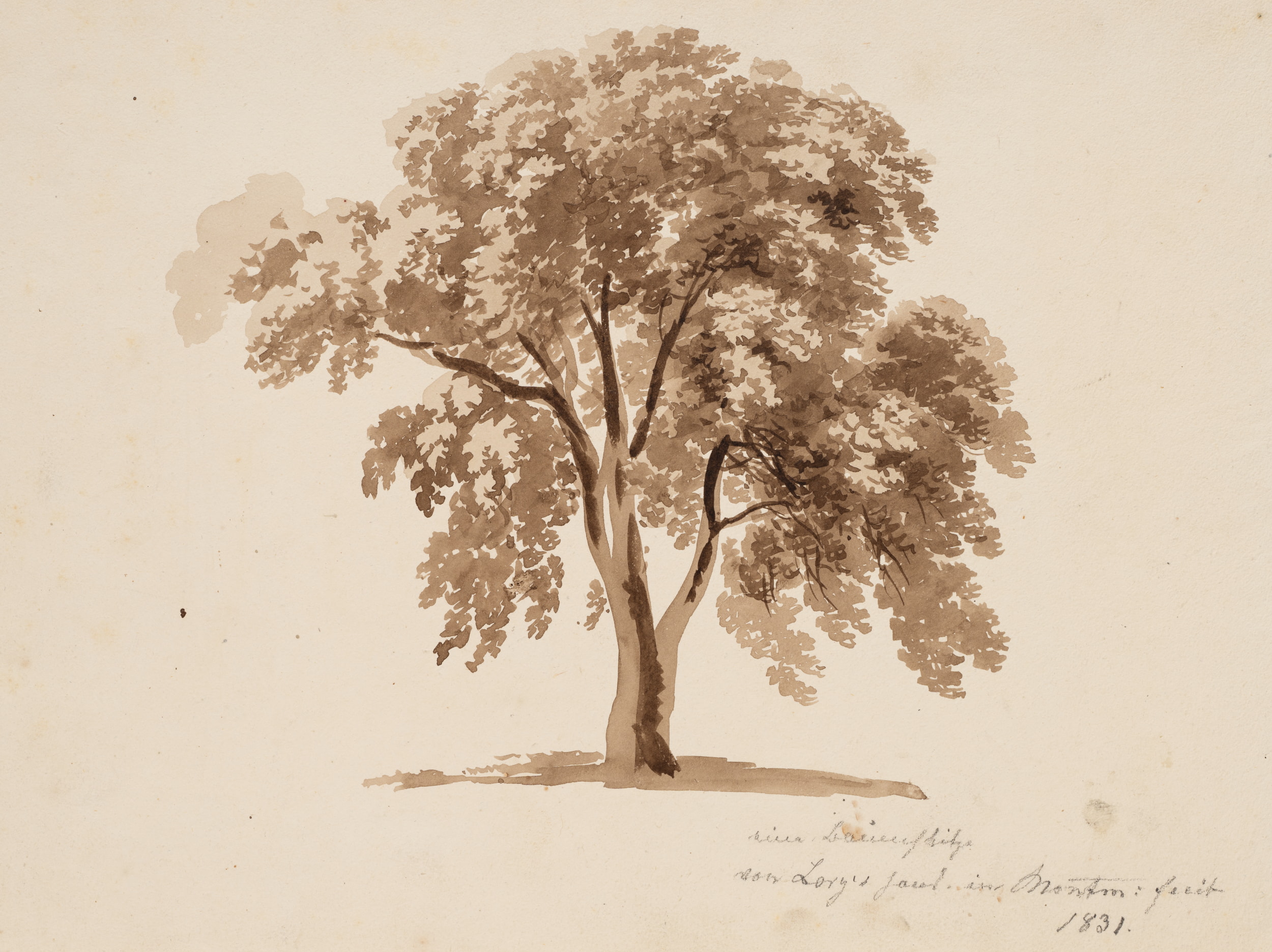 - Inscription: Lower right inscribed by the artist's hand: "eine Baumskizze von Lory's Haus[?] in Montan : fecit". Lower right dated: "1831".
