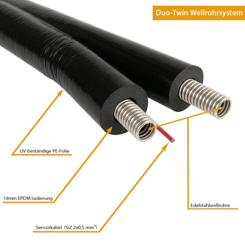 Durch die innovative Kombination aus hochwertigem Edelstahlwellrohr und einer 14mm dicken, temperaturbeständigen Isolierung wird die Solarleitung zu einem unverzichtbaren Bestandteil moderner Solarthermie-Systeme. Die komplett geschlossene Isolierung sorgt dafür, dass keine unerwünschte Feuchtigkeit eindringt, was einen effizienten Wärmetransport garantiert.