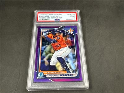 You are bidding on a 2024 BOWMAN CHROME BASEBALL PASCANEL FERRERAS 1ST PURPLE REFRACTOR 151/250 PSA 9. The buyer pays $3.50 for shipping. Good Luck!!