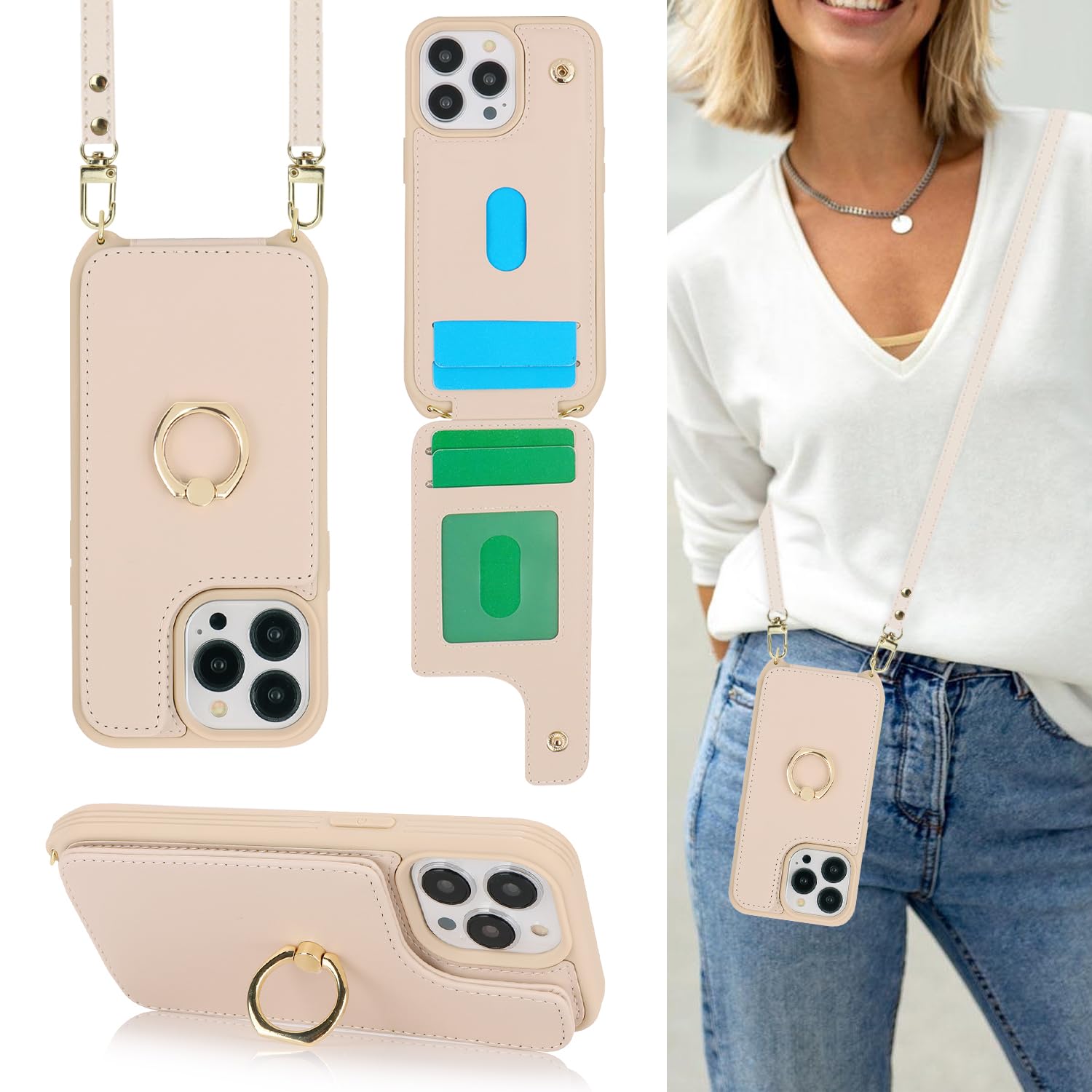 Lipvina for iPhone 13 Pro Case with Card Holder for Women,Crossbody Strap Lanyard,Credit Card Holder,Ring Stand,Snap Clasp,Wallet Case 6.1 inch (Beige)