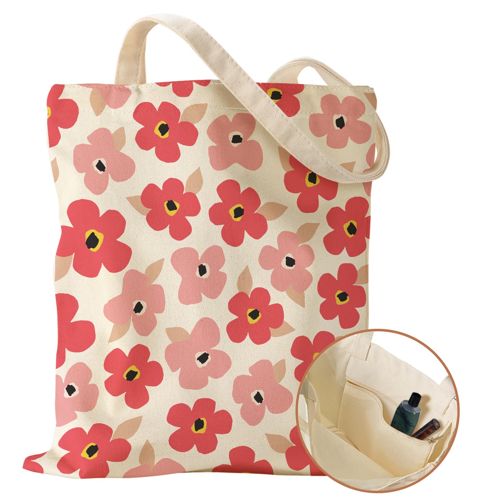 Miss Adola Aesthetic Canvas Tote Bag with Inner Pocket for Women, Cloth Cotton Totes Bag with Pattern for Shopping, Gym, PK Flower