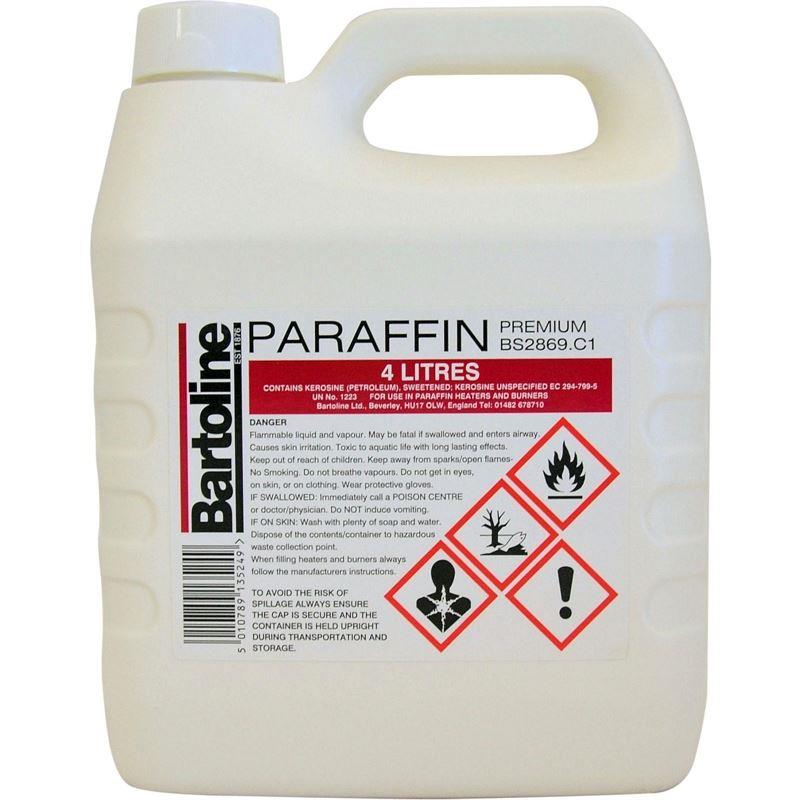 | BARTOLINE Premium Grade Paraffin 4 Litre. Premium Grade Paraffin 4 litres is clean burning high heat output paraffin refined to BS2869C1. Bartoline Paraffin is also known as Paraffin Oil, Liquid Paraffin or Kerosene/Kerosine and has many uses, the most popular being a fuel for domestic paraffin heaters and greenhouse heaters. It is also widely used as a cleaning fluid for motorcycle or car parts, a lubricant for reducing friction and wear in machinery and mechanical equipment, as well as in outdoor portable stoves for the more adventurous. |
