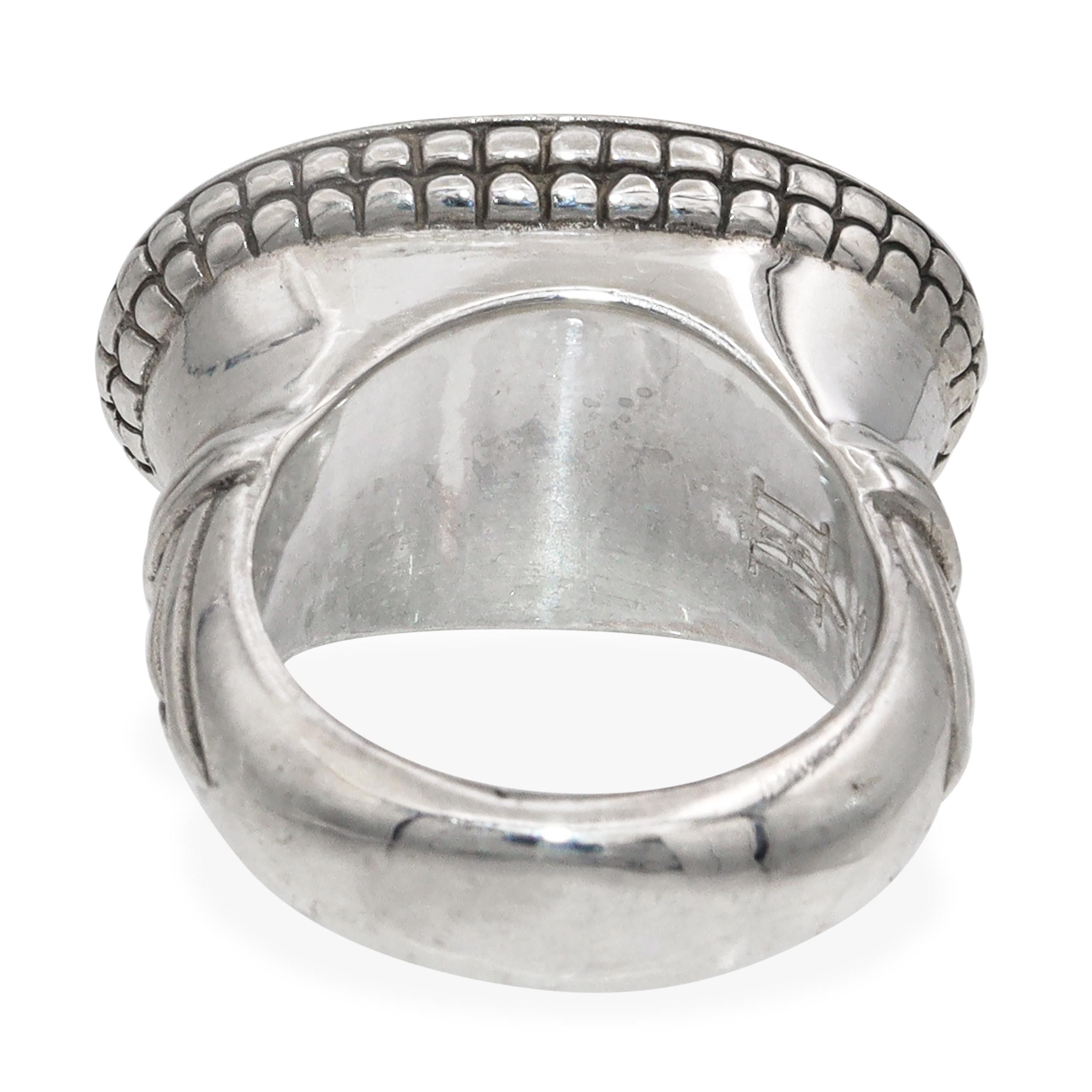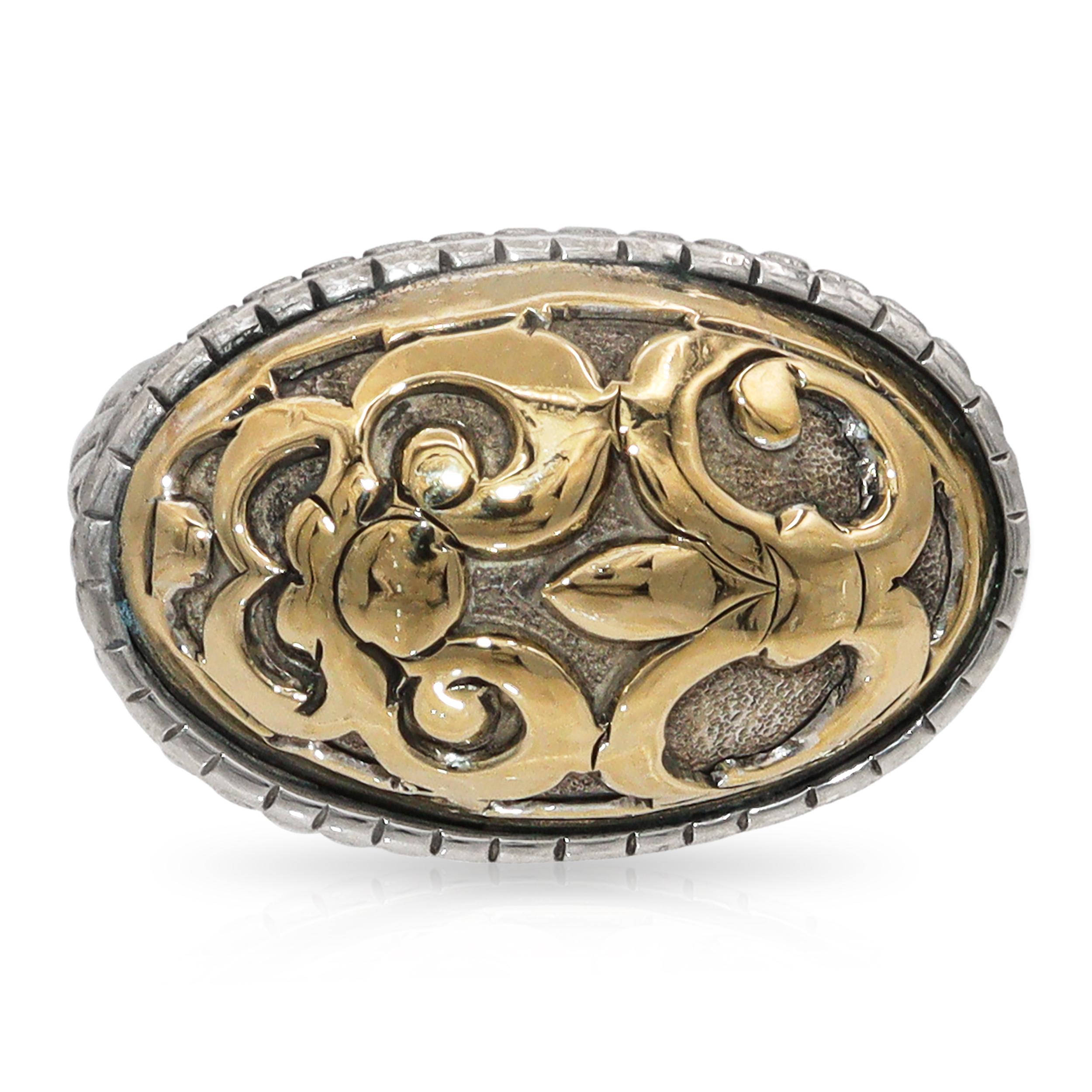 This exquisite John Hardy ring showcases the brand’s signature artistry, blending sterling silver with rich 18K yellow gold accents. The bold oval-shaped face is adorned with an intricate floral and vine motif in polished gold, set against a textured silver background for striking contrast. A detailed beaded border and sculpted shank complete the design, reflecting John Hardy’s renowned craftsmanship and attention to detail. Elegant yet substantial, this ring makes a powerful statement and is perfect for collectors of distinctive designer jewelry. Hallmarked for authenticity.