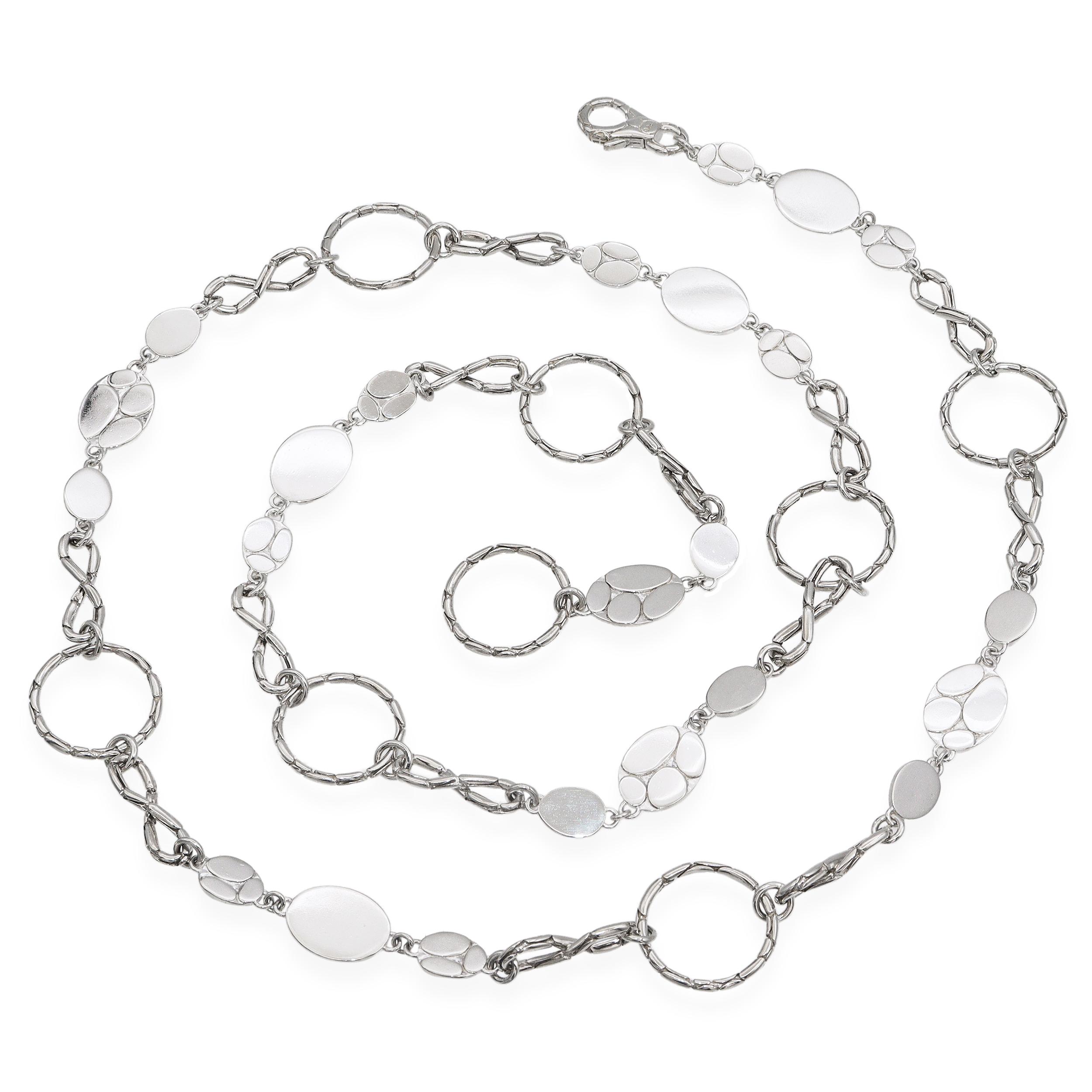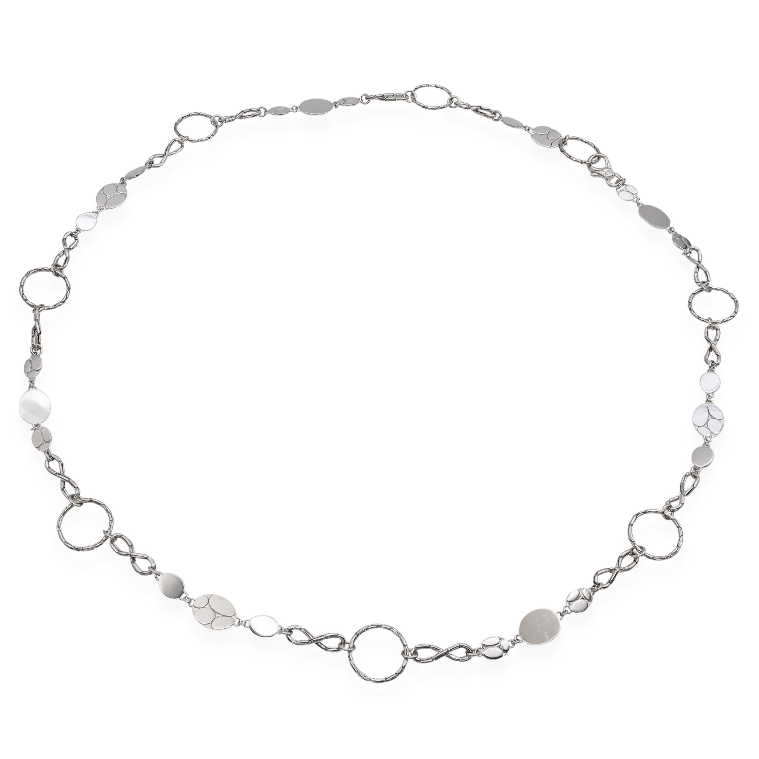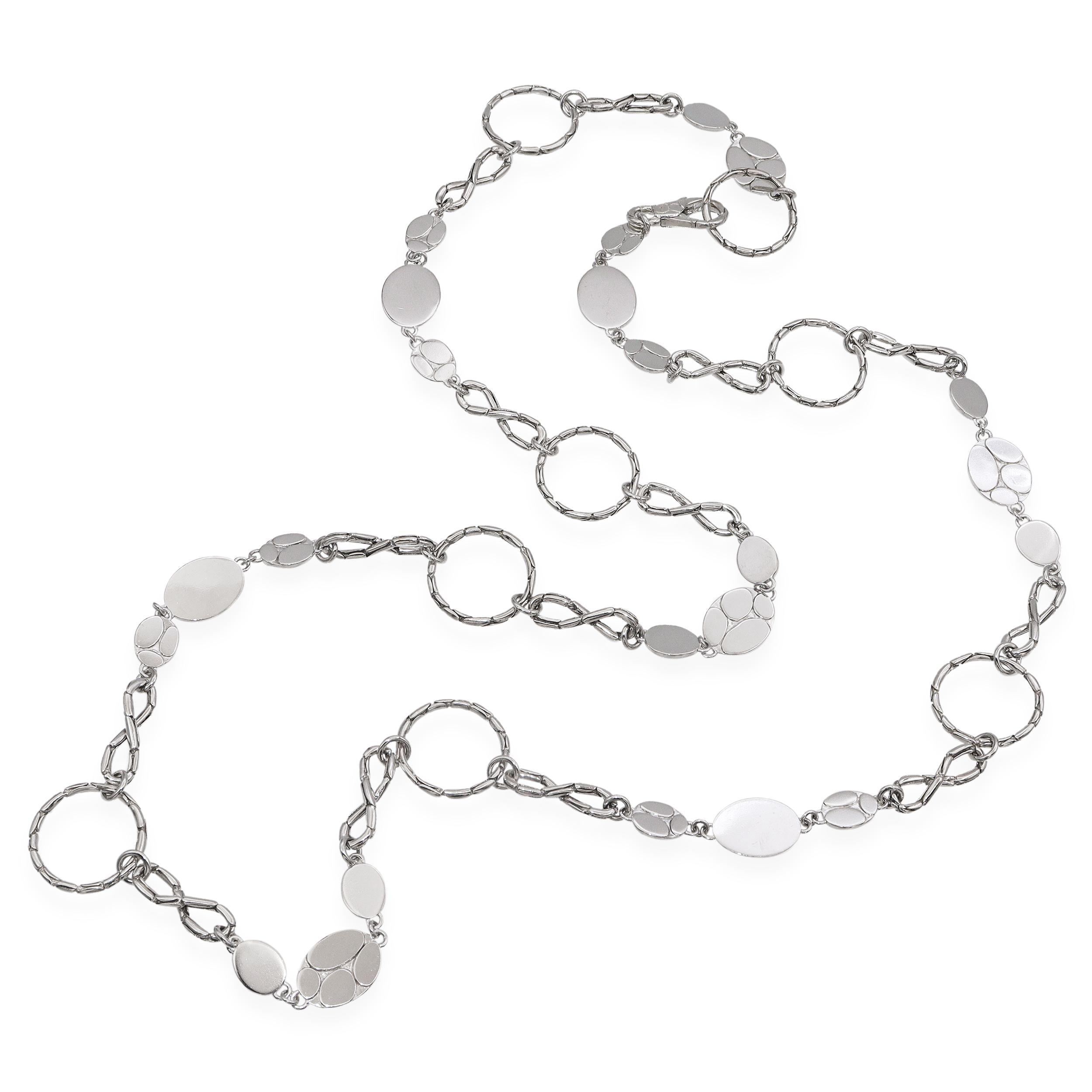 This elegant John Hardy necklace is crafted in sterling silver and features a striking mix of hammered-texture open links and smooth round dot stations. The alternating circular and oval elements create a dynamic, versatile design that reflects John Hardy’s signature craftsmanship and attention to detail. Measuring long in length, this necklace can be worn as a single dramatic strand or doubled for a layered look. Both modern and timeless, it’s a versatile accessory perfect for elevating any ensemble.
