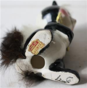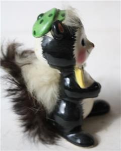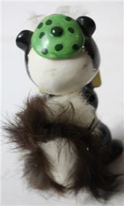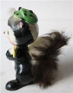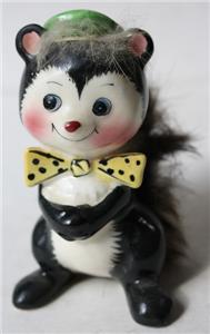 Here's a great Ceramic Porcelain Hand Painted Made in Japan Cartoon Comic Style Skunk wearing a Yellow Polka Dot Bow Tie and Green Hat Blue Eyes Faux Fur Skunk Figurine. It is Adorable. It measures about 4 1/4 inches tall and about 2 1/4 inches long. It is marked with foil label-SEE ALL PHOTOS!