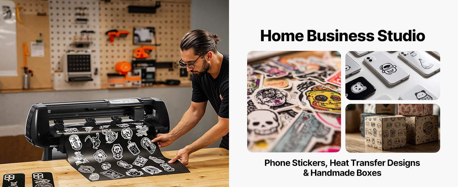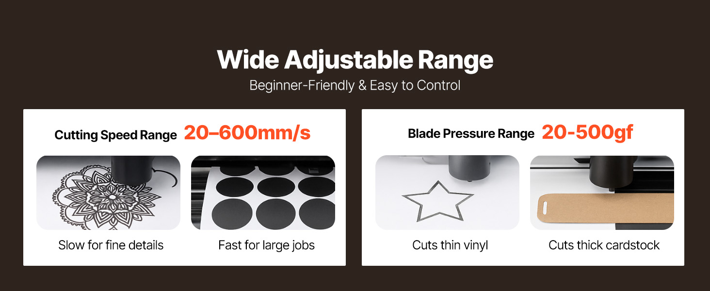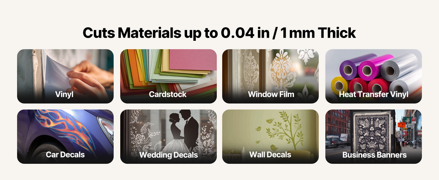 - Wide Compatibility: This vinyl cutter accommodates both sheets and rolls up to 1 mm in thickness, with an adjustable cutting force ranging from 20 to 500 gf. It is suitable for various materials, including vinyl, heat transfer vinyl, adhesive vinyl, magnetic sheets, sticker paper, car graphics, and more, making it ideal for personal or professional use.