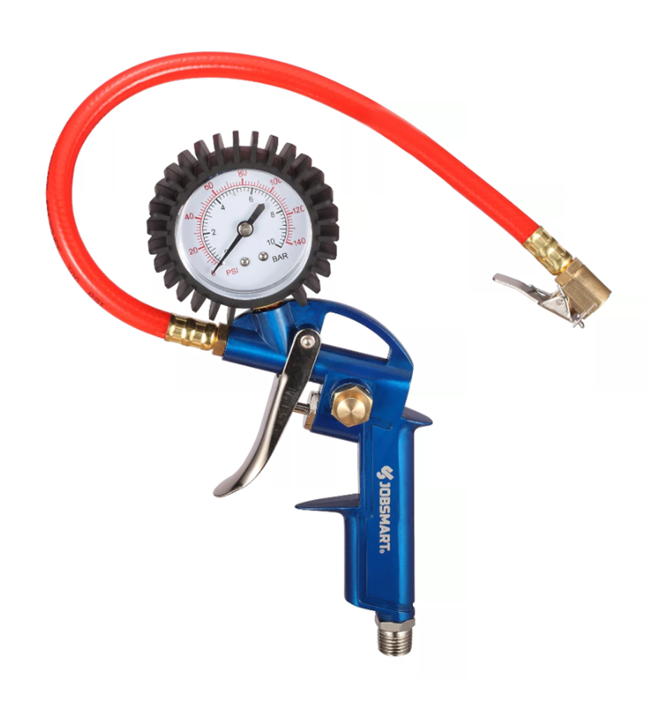 Inflate your tires easier than ever with the JobSmart Tire Inflator with Gauge. This inflation gun conveniently features a chuck and gauge all in one unit for easy use. There's a built-in relief valve to reduce pressure in overinflated tires. A clip enables hands-free operation, too. Shop more from JobSmart today.