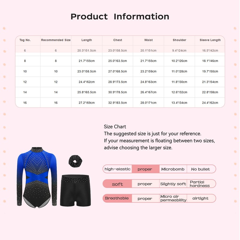 Size Chart: The suggested size is just for your reference. If your measurement is floating between two sizes, advise choosing the larger size. (Measurements shown in the size chart refer to item measurements, not body)| Tag No. | Recommended Size | Leotard Length | Chest | Shoulder | Sleeve Length | Shorts Length | Shorts Waist | Hip |