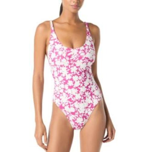 Hit the surf in style with MICHAEL Michael Kors' swimsuit, a sleek one-piece design with a contrasting floral print and fun strappy back.