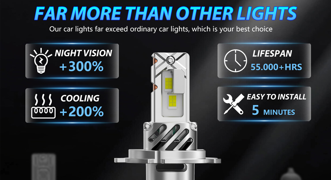 - Compact design, easy to install: The LED light adopts an all-in-one compact design with built-in driver and fan, taking up less housing space, almost the same design as the original halogen bulb, easy to install.