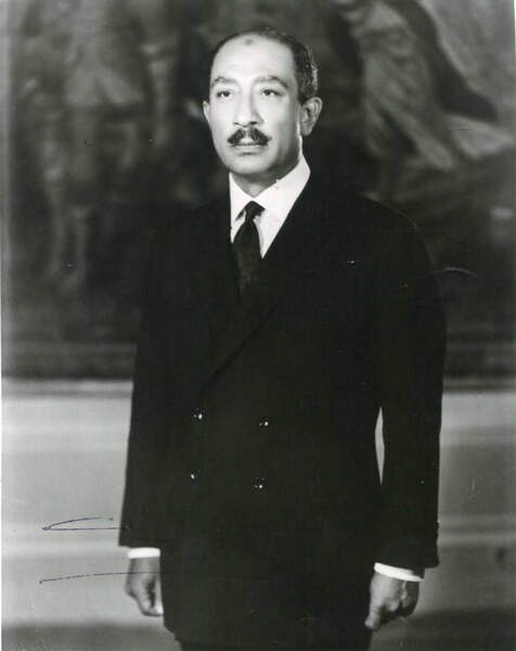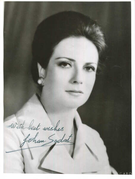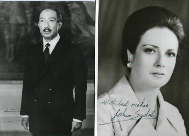 Signed vintage photograph, shows Anwar as Sadat in a beautiful half length portrait, 6,5 x 8,25 inch, signed in dark ink, with mild creases to the upper left corner and trimmed edges - in fine. Accompanied by a signed vintage semi-glossy photograph, shows Jehan Sadat in a head and shoulders portrait, 7 x 9,25 inch, signed in blue ink "With best wishes - Jehan Sadat", with mild signs of wear to the edges, and a few letters are very slightly smeared - in fine condition.
