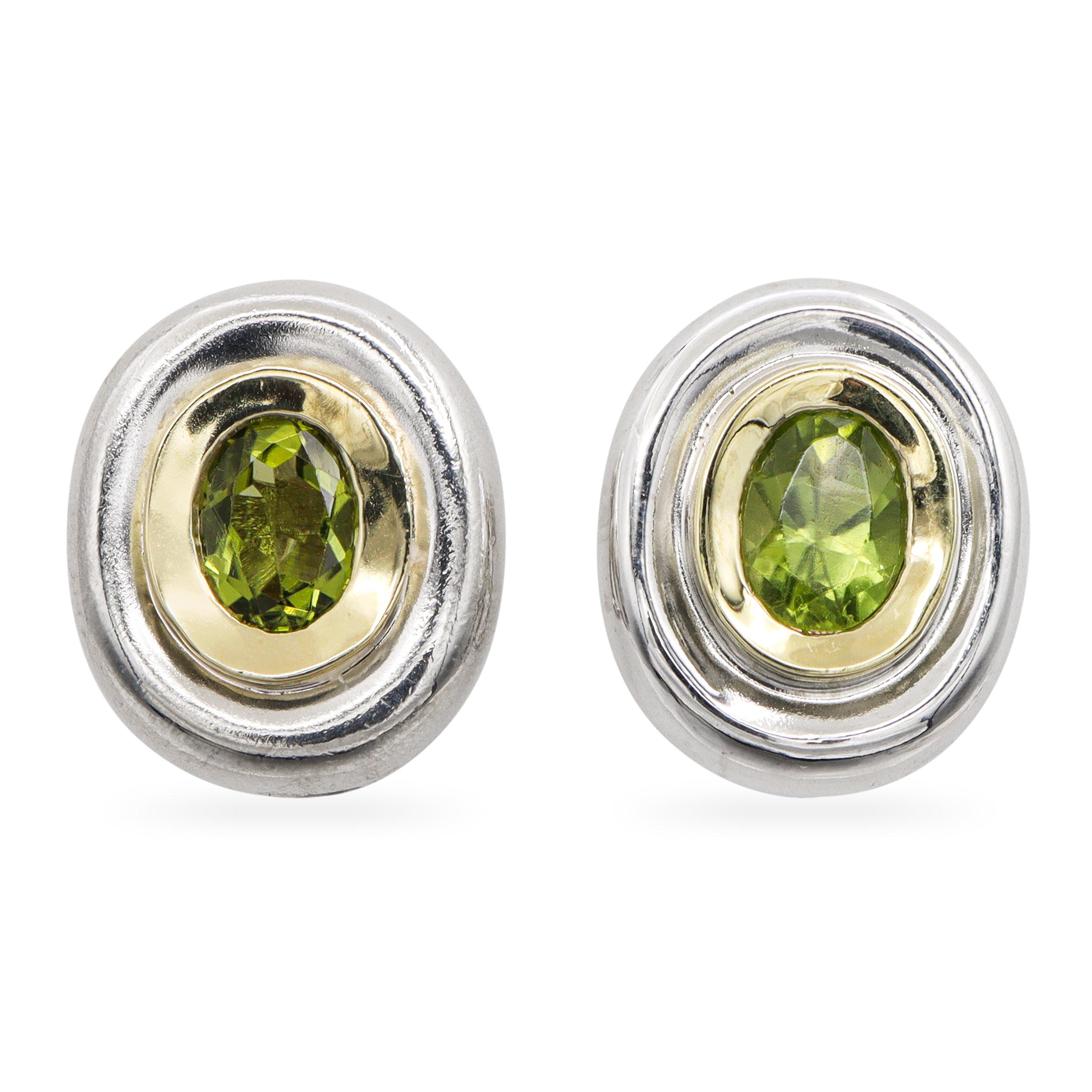 Elegant vintage earrings featuring vivid oval-cut peridot gemstones set in 18K yellow gold bezels, framed by sculptural sterling silver borders. The two-tone design enhances the brilliance of the stones while adding warmth and dimension. Designed with omega backs and posts for comfort and secure wear, these earrings combine timeless style with luxurious craftsmanship — a striking accent for any collection.