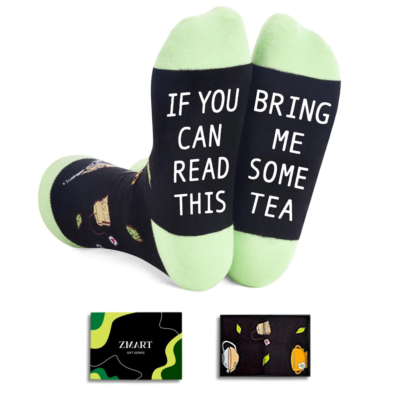 - TEA LOVER GIFTS: These socks are perfect for tea lovers! The top of the black socks features tea bags, kettles, tea leaves, and steaming mugs, while the bottom is sewn with a humorous hidden message: "IF YOU CAN READ THIS, BRING ME SOME TEA."