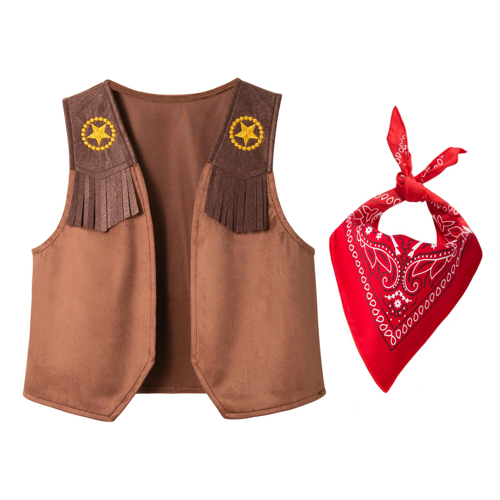 Unique Western Cowboy Style - The vest design features a dark brown shoulder area adorned with a yellow five pointed star badge, and tassel decorations below the shoulders, paired with a red paisley bandana.