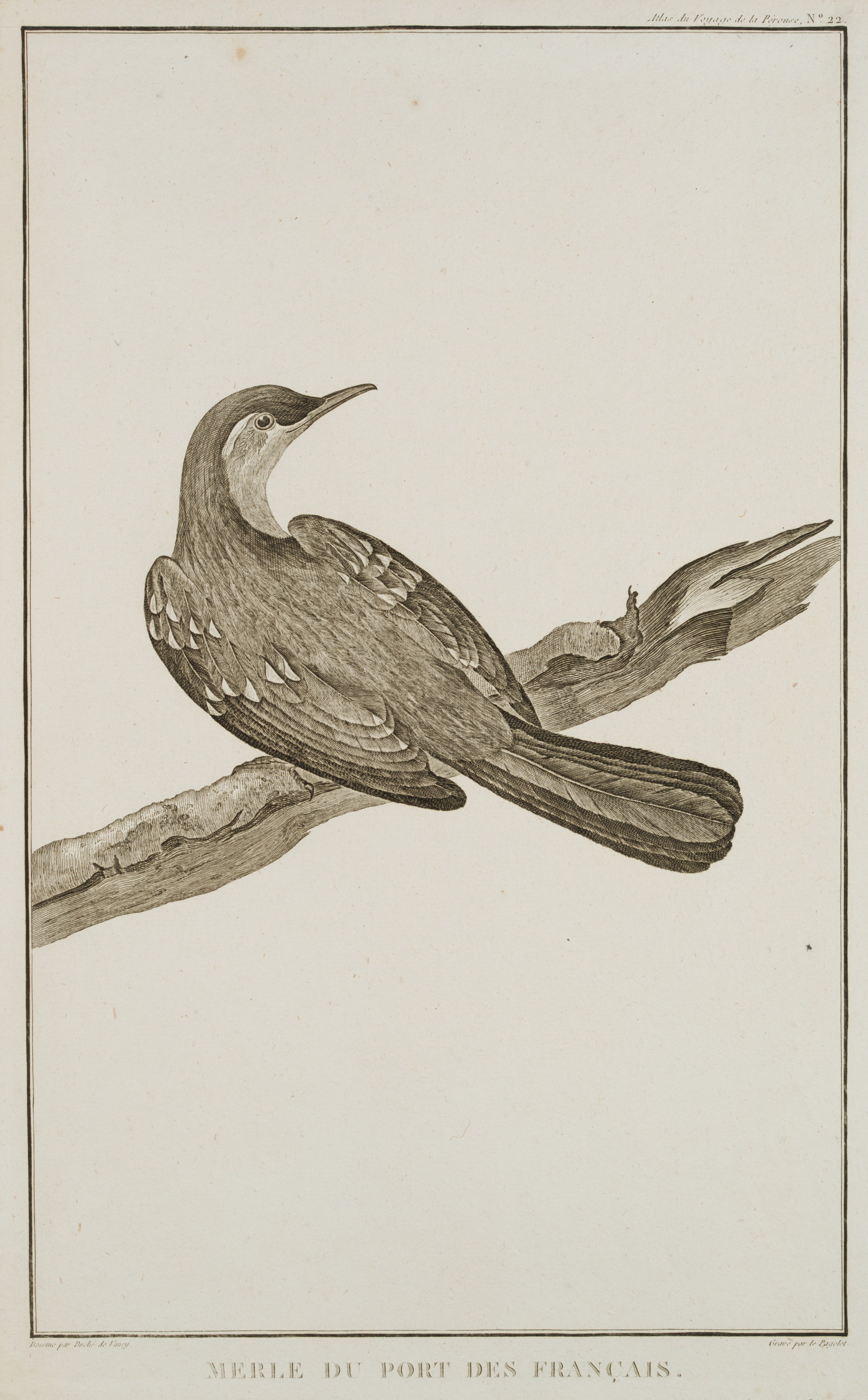 - Bezeichnung: Unten im Druck bezeichnet: "Merle du Port des Français. / L. Aubert scrips.". Oben rechts im Druck nummeriert: "Atlas du voyage de La Pérouse No 22".