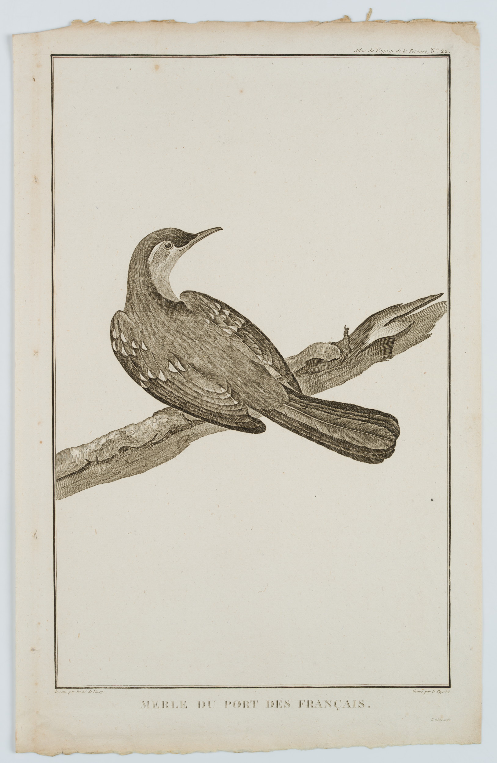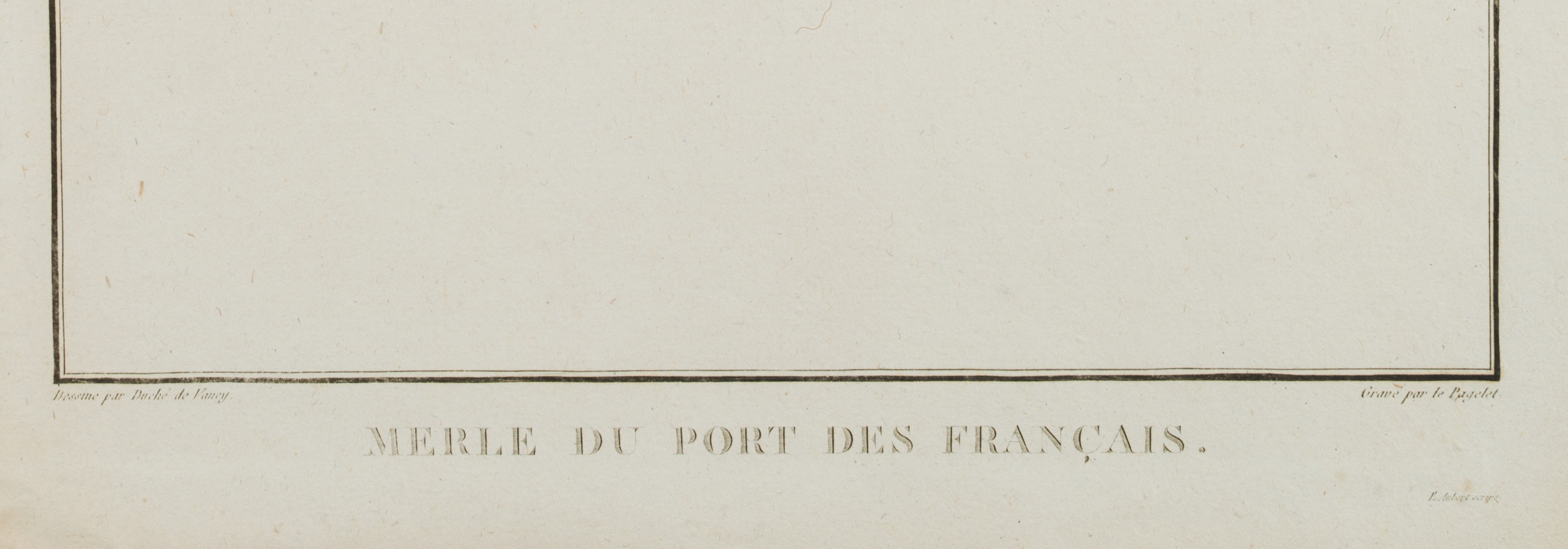 - Inscription: At the lower part inscribed in the printing plate: "Merle du Port des Français. / L. Aubert scrips.". Upper right numbered in the printing plate: "Atlas du voyage de La Pérouse No 22".
