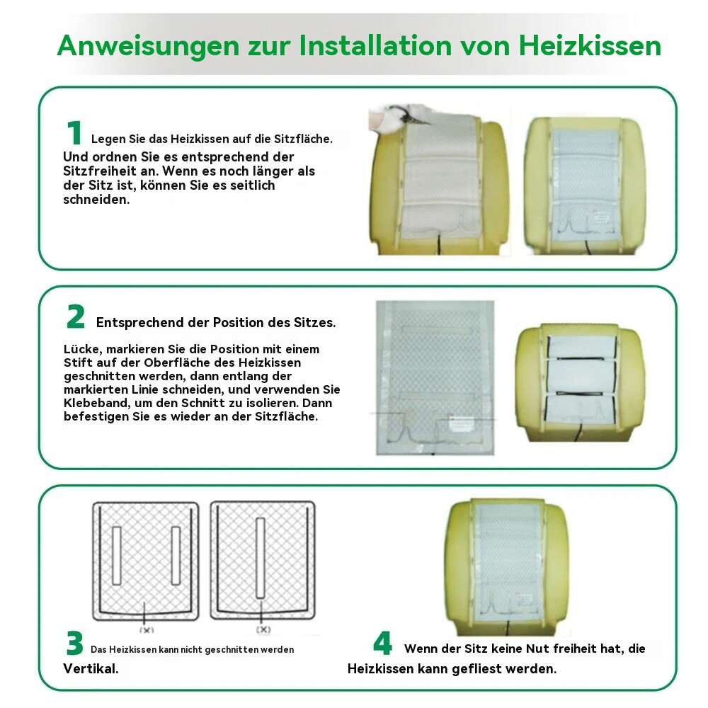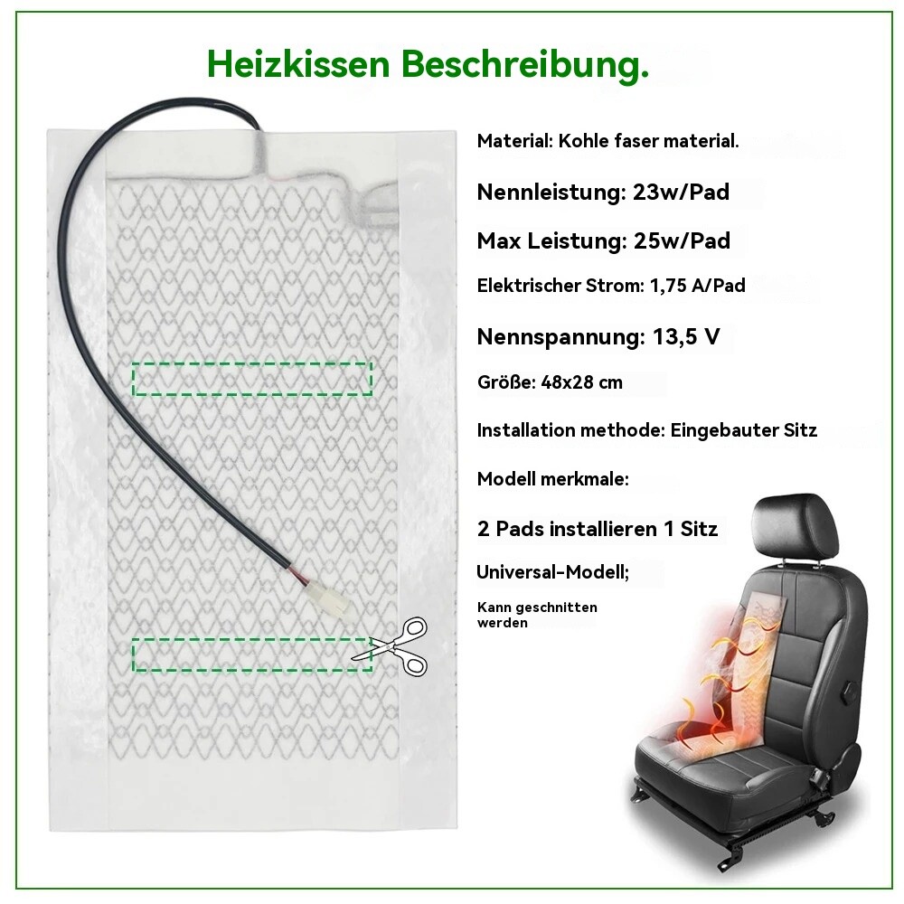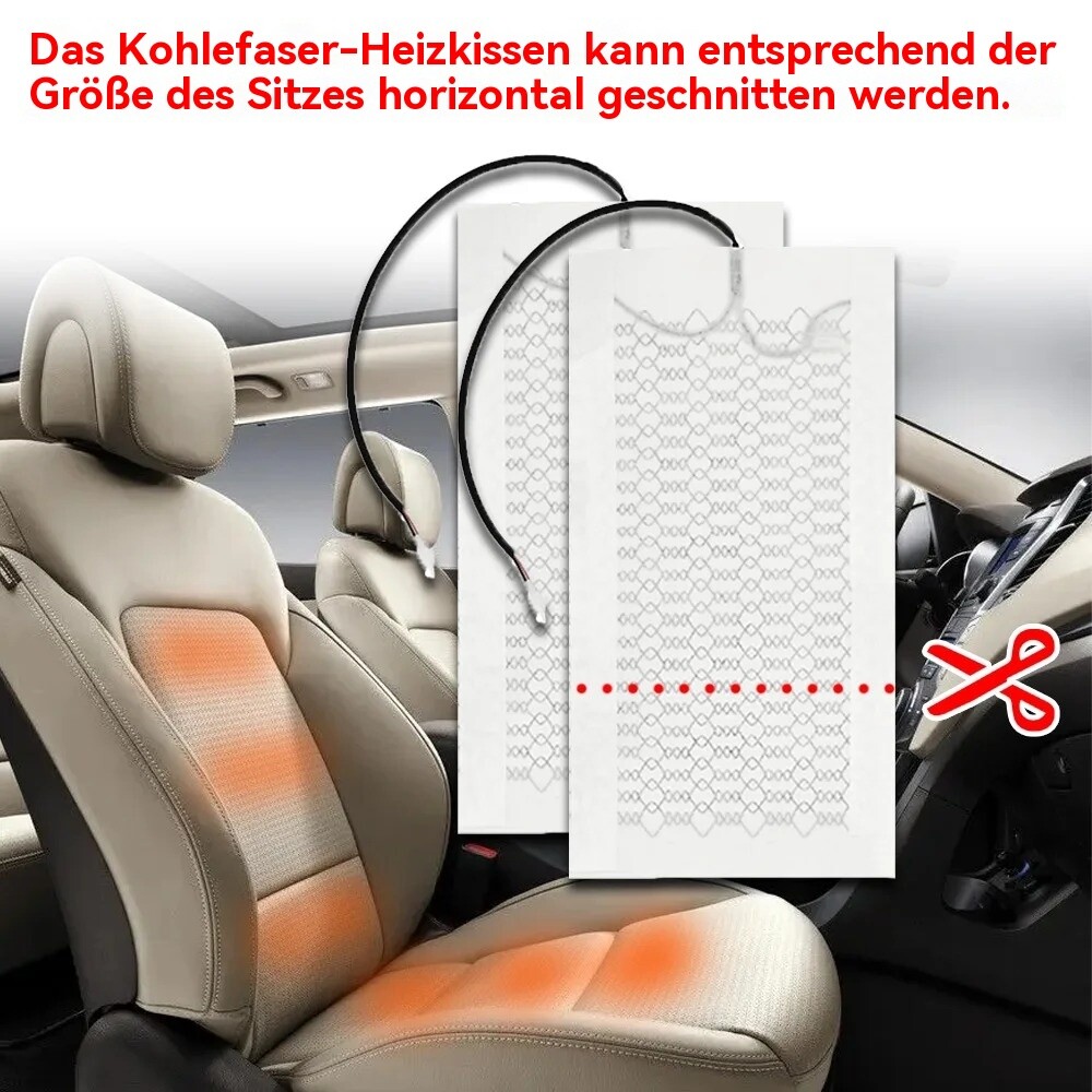 Zwei Heizkissen für einen Sitz: 1 Stück auf der Rückseite und 1 Stück auf der Unterseite. Mit Aufkleber, einfach zu installieren.
