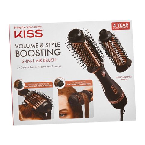 Experience the ultimate in hair styling with the KISS Volume & Style Boosting 2-in-1 Air Brush. This versatile tool features a unique waterdrop-shaped barrel that provides maximum volume and exceptional grip, making it easy to style even the most challenging sections of hair. The round-shaped barrel is perfect for creating soft curls or waves, allowing you to customize your look effortlessly. With its 3X ceramic-coated barrels, this air brush minimizes heat damage while delivering a beautiful, glossy finish. The activated charcoal pins enhance drying and styling efficiency, ensuring your hair looks its best every time. The slim ergonomic handle offers superior control, making styling comfortable and easy. Plus, with four heat settings and tangle-free bristles, you can achieve your desired style without the hassle of tangles or excessive heat exposure.