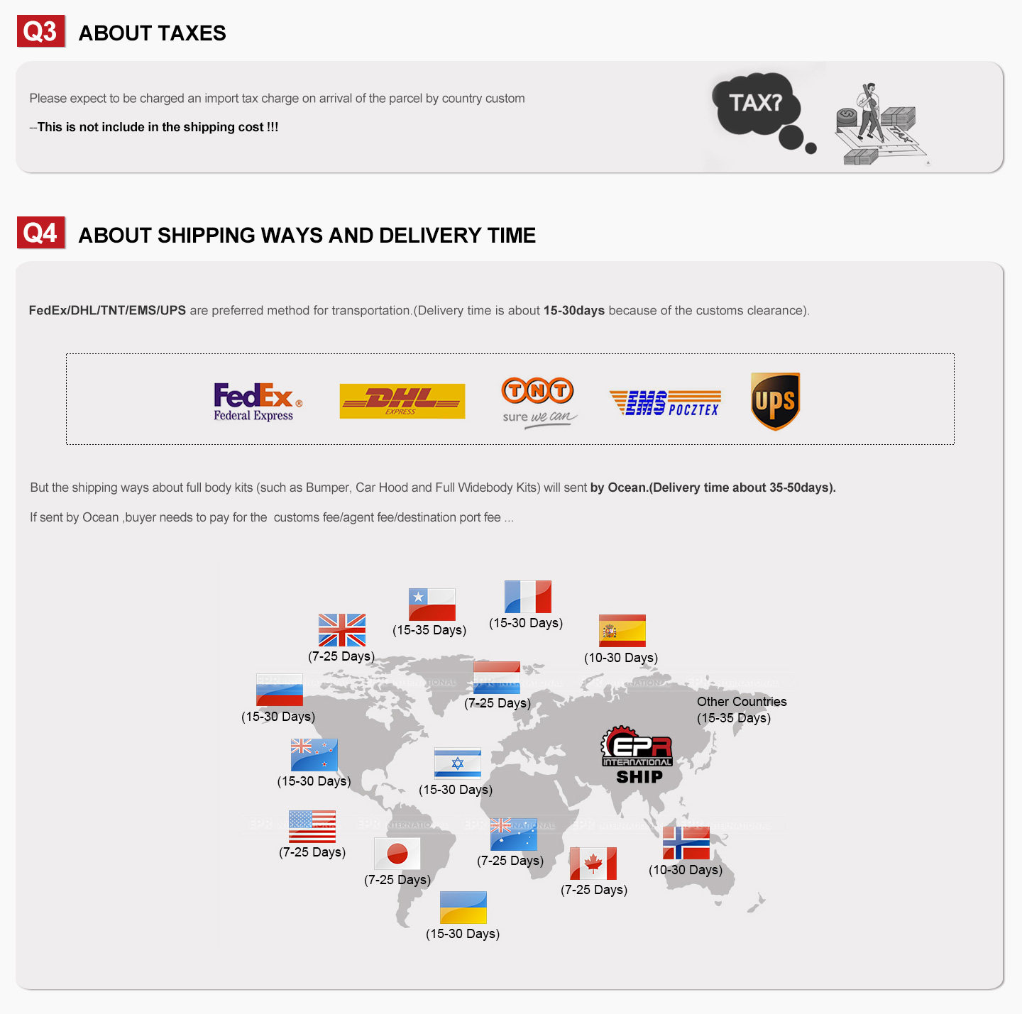 (such as Bumper, Car Hood and Full Widebody Kits) will sent by Ocean.(Delivery time about 35 - 50 days).