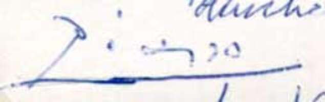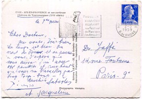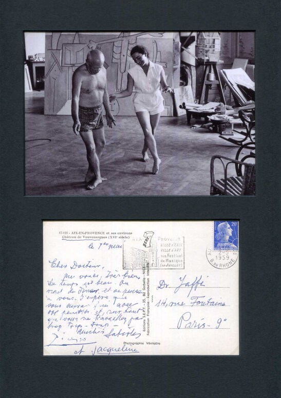 Postcard signed, one page (stamped), 6 x 4 inch, Château of Vauvenargues, 1.05.1959, in French, addressed to Dr. Jaffé, letter written and signed by Jaume Sabartés* - also signed by Pablo Picasso and his second wife Jacqueline Roque (1926-1986) in blue ink "Picasso" & "Jacqueline", attractively mounted (removable) for fine display with a photograph (altogether 8,25 x 11,75 inch), with very mild signs of wear - in nearly very fine condition.