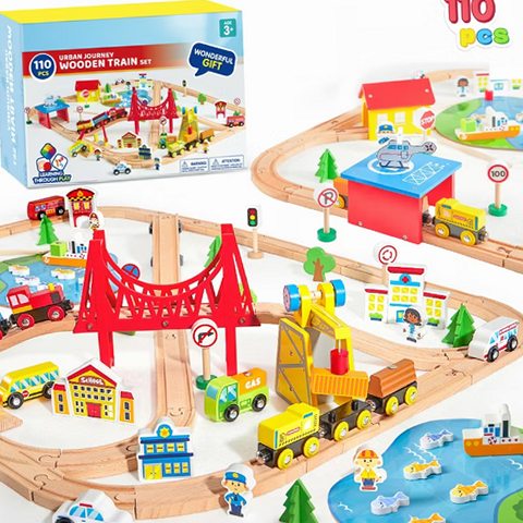 All-Inclusive City Adventure: This 110-piece wooden train set features tracks, 6 magnetic trains, 5 themed vehicles, a helicopter, and a ship with a fishing puzzle, offering endless imaginative play for kids aged 3-8.