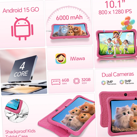 Extended Battery: Provides up to 9 hours of use with its 6000mAh battery, featuring 10W fast charging that reaches 60% in 30 minutes via a Type-C port.