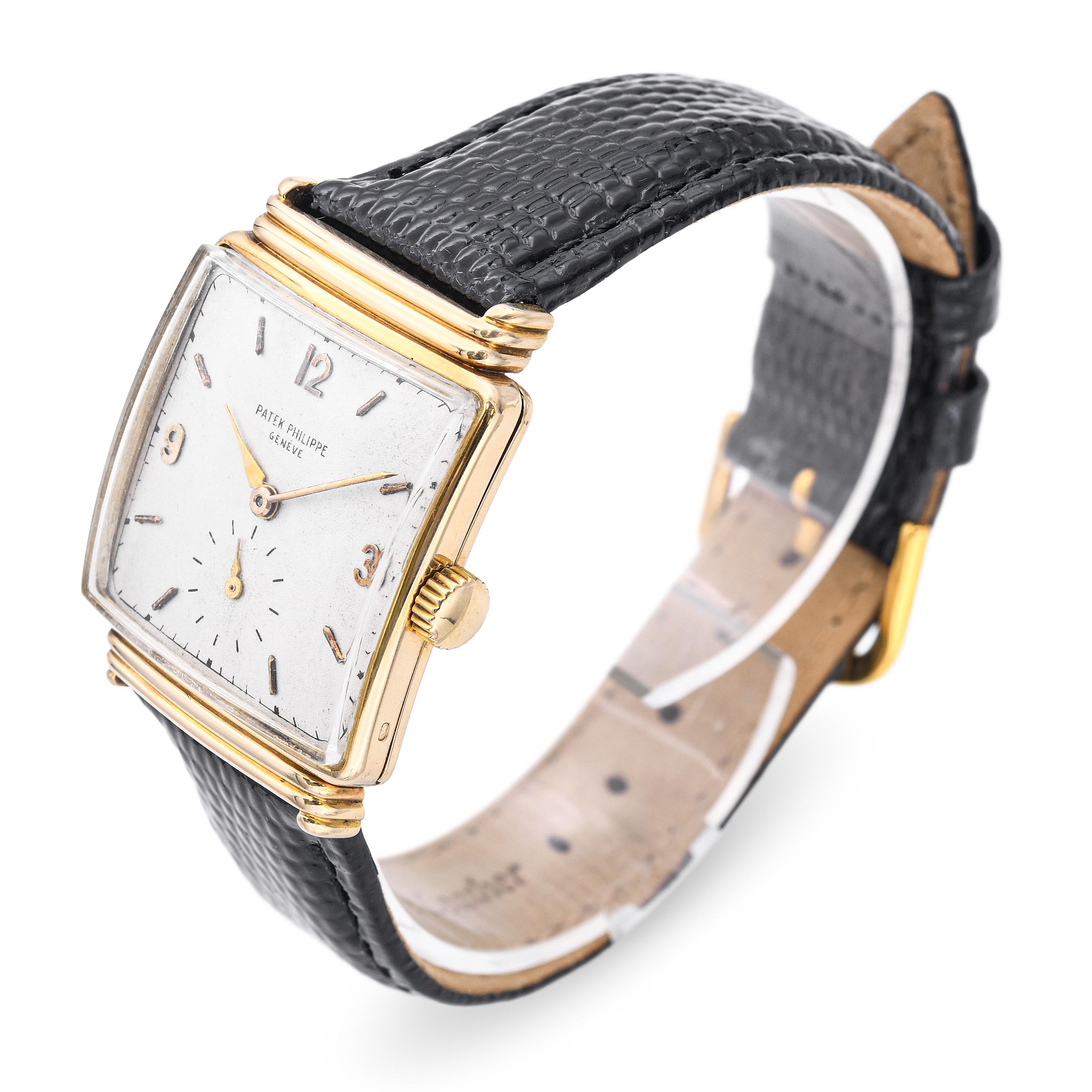 A refined vintage Patek Philippe men’s dress watch crafted in solid 18k yellow gold, featuring a distinctive square case with stepped Deco-inspired edges. The aged silver dial displays gold Arabic numerals at 12 and 3, matching gold baton markers, and a classic small-seconds subdial for an elegant, understated look. Powered by a traditional hand-wind Patek Philippe movement, the watch embodies the timeless craftsmanship and restraint the brand is known for. The case back is personally engraved with “Ralph Bodek 12-25-45,” adding a touch of historical character and making it a meaningful presentation piece from the mid-20th century. Paired with a textured black leather strap, this vintage Patek remains a sophisticated and collectible example of early post-war Swiss watchmaking.