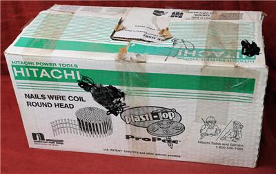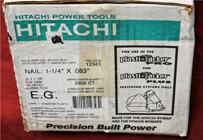 Cartons of coils of Hitachi ring shank nails with 1 inch platic caps, Item # 12343. For use in Plasti-Tacker Pro NV50AP and Plasti-Tacker Plus NV50AP2.