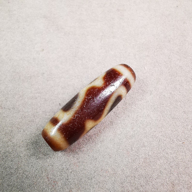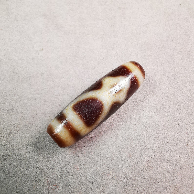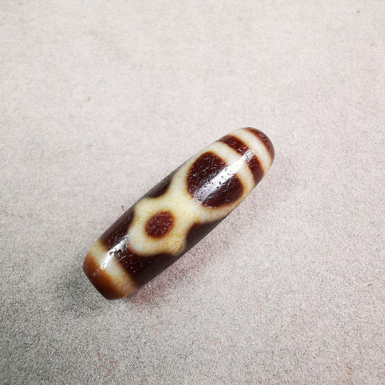 Dzi beads are made from agate, and may have decorative symbols composed of circles, ovals, squares, waves or zig zags, stripes, lines, diamonds, dots, and various other archetypal and symbolic patterns. Colors mainly range from brown to black, with the pattern usually in ivory white. Dzi beads can appear in different colours, shapes, and sizes; the surface is usually smooth and waxy, presumably resulting from wear over a long period of time.