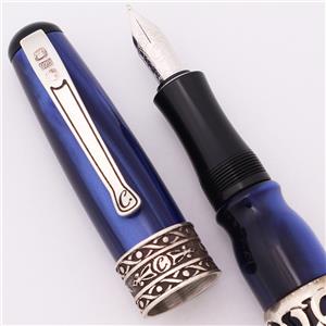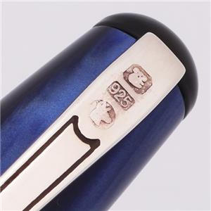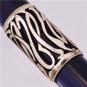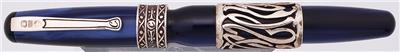 Color The body and cap is made of beautiful Blue resin, with elaborate trim and band work in sterling silver. The barrel has a wide decorative band in a pattern that Curtis calls "Nouveau".
