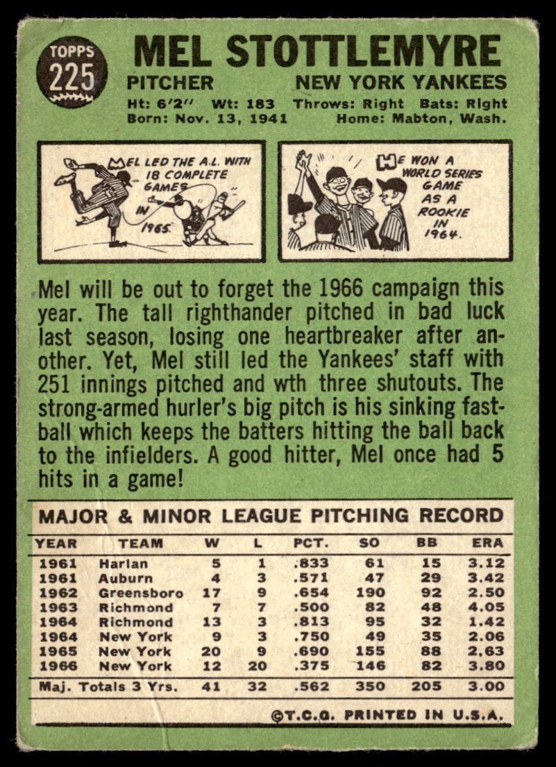 1967 Topps Mel Stottlemyre -- New York Yankees #225