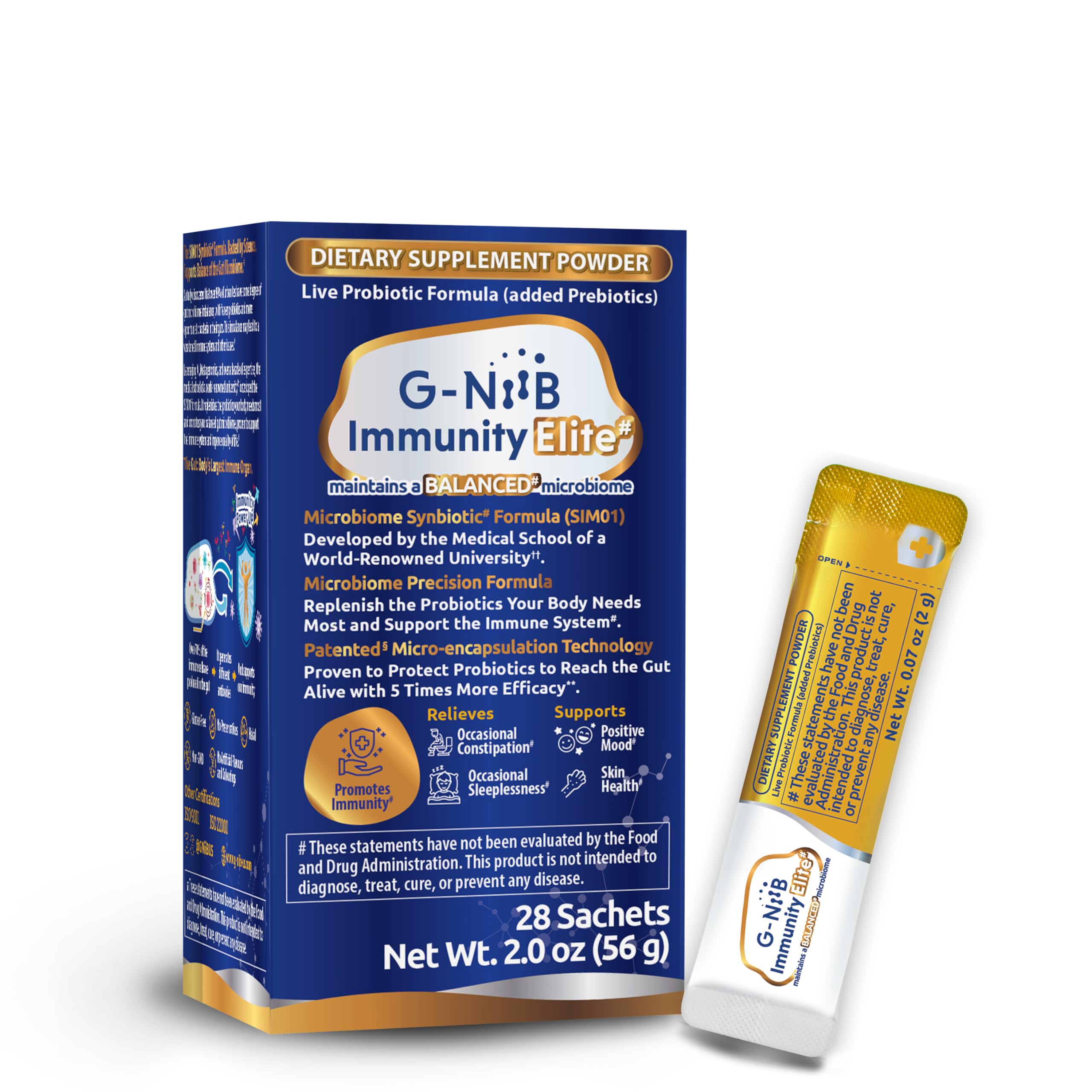 G-NiiB Immunity Elite (SIM01) is a groundbreaking probiotic and prebiotic blend expertly crafted by world-renowned medical professionals using advanced microbiome technology and AI-driven research. Scientifically proven to be 5X more effective than standard probiotics, it precisely replenishes key probiotics essential for digestive balance and immune health. Featuring patented microencapsulation technology, our probiotics reliably survive stomach acid, arriving alive in your gut for optimal effectiveness. With over 70% of the body's immune cells found in the gut, maintaining a balanced gut microbiome is pivotal; G-NiiB Immunity Elite has been scientifically validated to increase 27 beneficial gut bacteria types, enhancing your immunity from within. This potent formulation, enriched with nourishing prebiotic fibres (GOS, XOS, and Resistant Dextrin), supports comfortable digestion and regularity while promoting probiotic effectiveness. Additionally, a balanced gut microbiome contributes to positive mood, clearer skin, and restful sleep, helping alleviate occasional sleeplessness and fostering emotional wellness. Enjoy convenient daily use with our tasty, marshmallow-flavoured powder—no capsules, no water needed, and ideal for travel without refrigeration. Trust G-NiiB Immunity Elite, powered by the extensively researched SIM01 synbiotic formula, for comprehensive gut health and enhanced overall well-being.