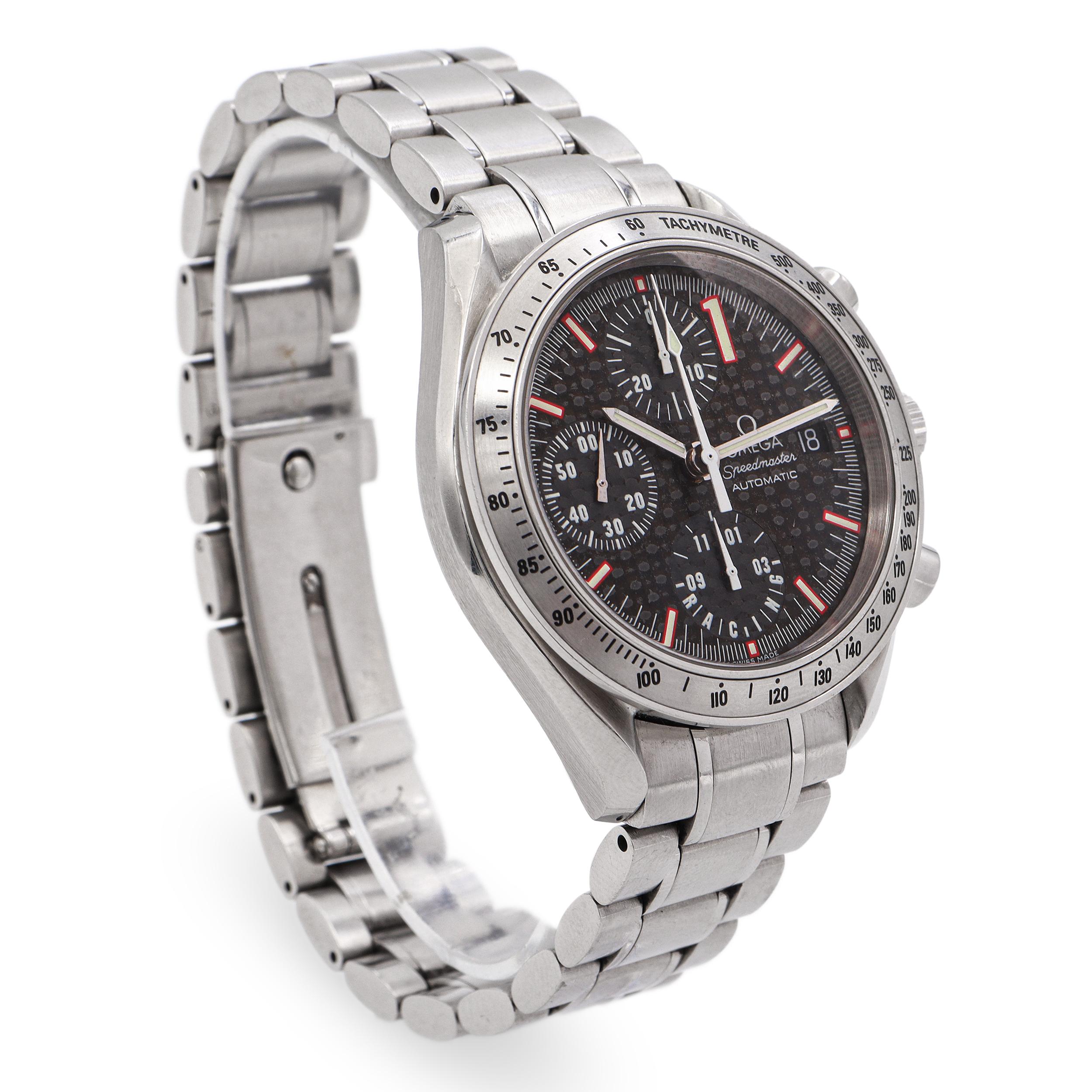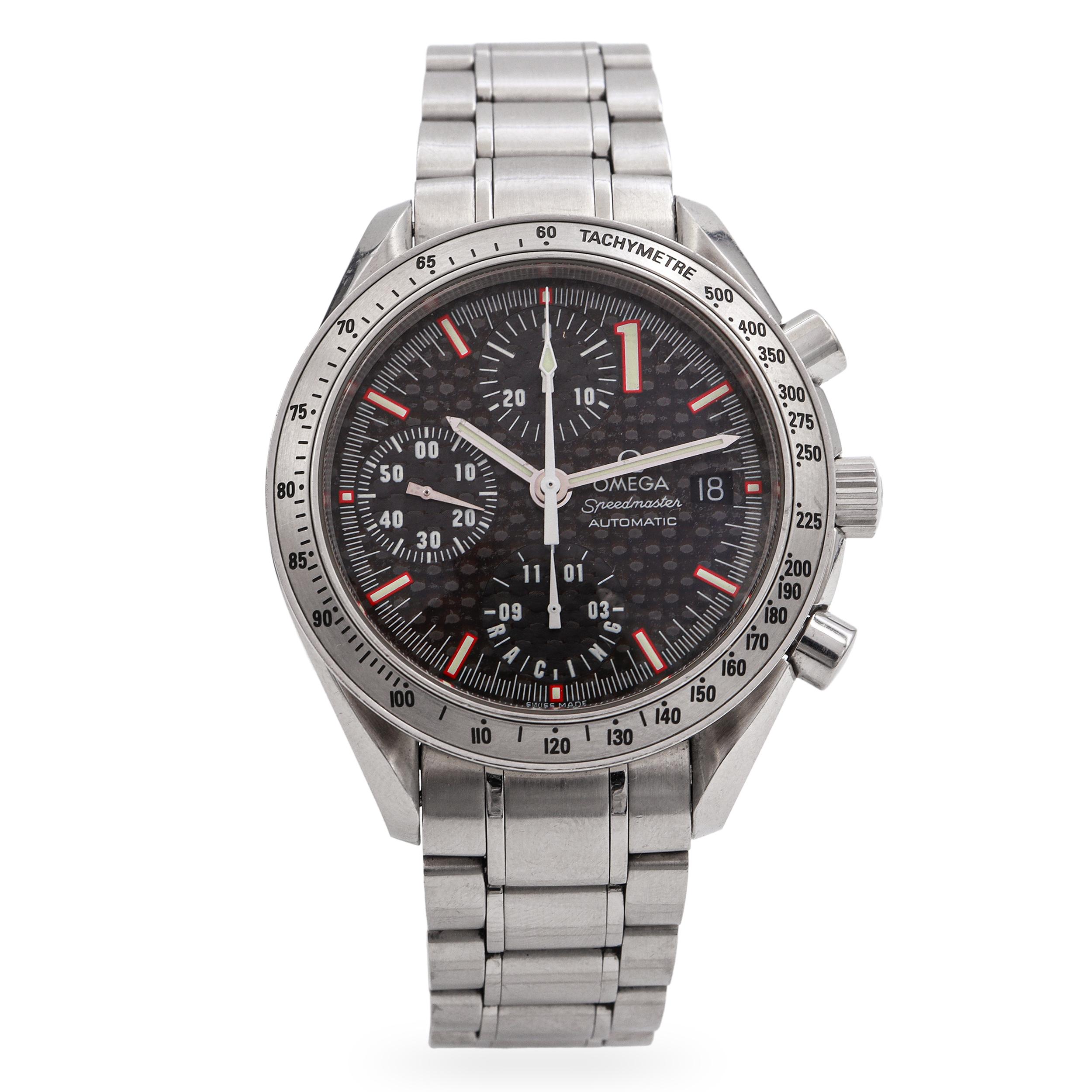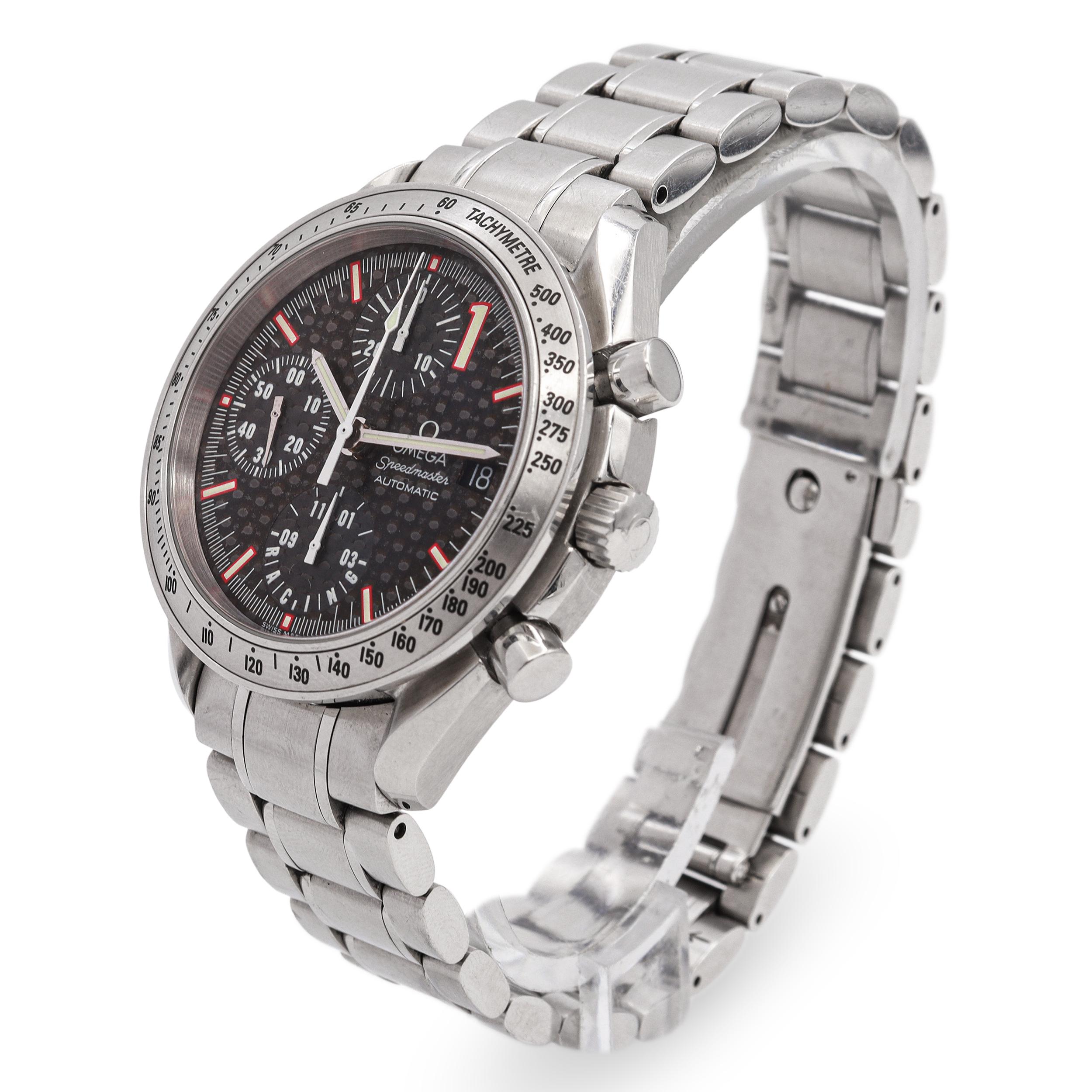 Striking Omega Speedmaster Racing Michael Schumacher men’s wristwatch crafted in stainless steel and powered by an automatic chronograph movement. This Racing edition features the distinctive carbon-style dial with bold red accents, tachymeter bezel, and multi-subdial layout that reflects its motorsport heritage. The watch is fitted with an Omega stainless steel bracelet and includes the original Omega presentation box along with accompanying paperwork as shown. A highly collectible Speedmaster variant celebrating Michael Schumacher’s racing legacy, offering both everyday wearability and strong enthusiast appeal.