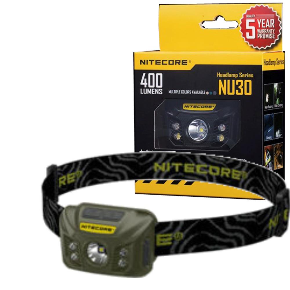 Nitecore NU30 LED Headlamp every day & tactical users. XP-G2 S3 LED output up to 400 Lumens of wide angle illumination with a beam throw up to 400 feet. USB-Rechargeable runs on a convenient internal Lithium Ion battery pack of 1800mAh, which can power the headlamp on its lowest brightness for 330 hours. The NU30 even comes with a power indicator built into its dual body switch, flashing a red LED to display the battery pack's remaining charge.