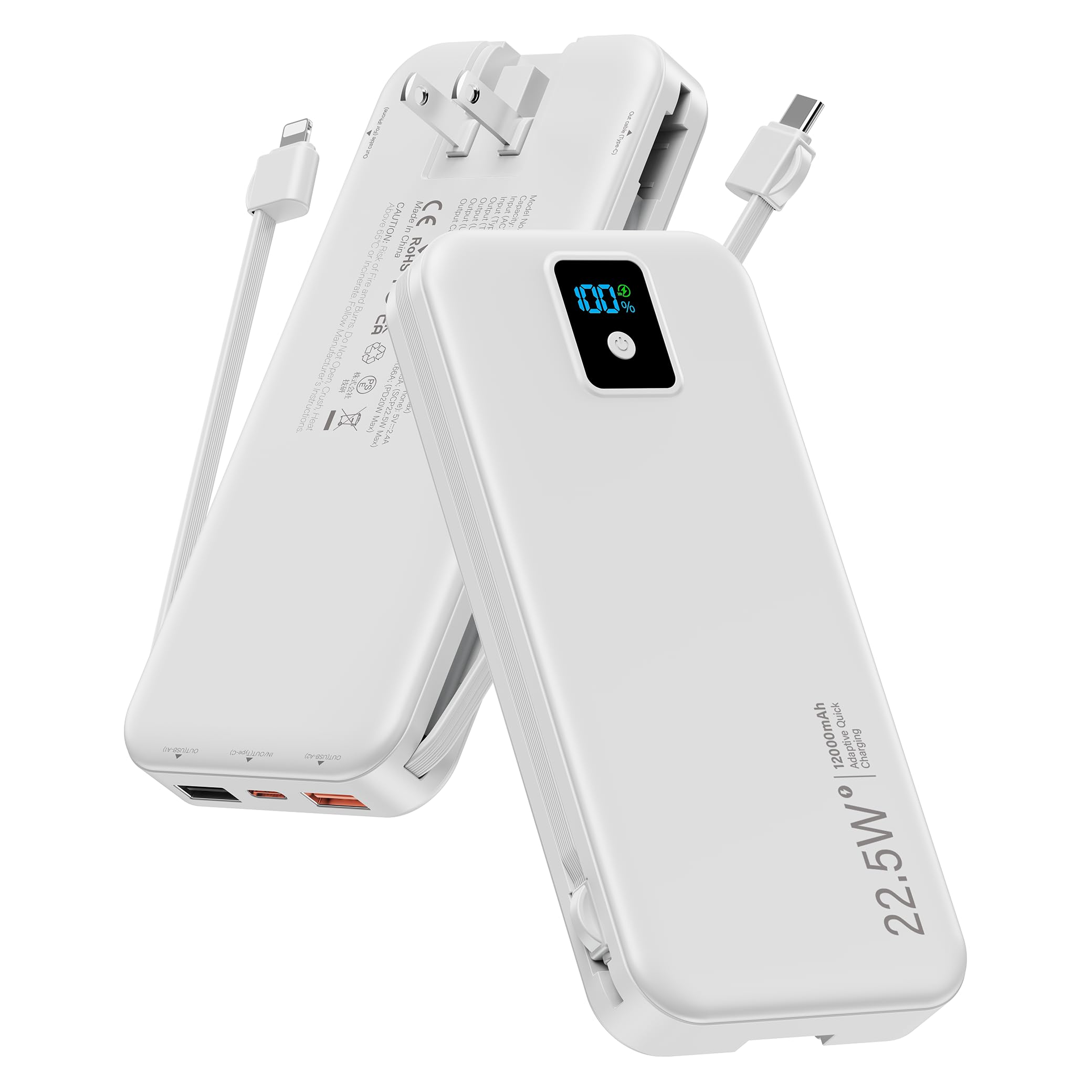 Portable Charger, 12000mAh 22.5W Fast Charging Power Bank with Built-in Cables & Wall Plug, Travel Essentials Battery Pack with LED Display, USB C External Battery Bank for iPhone iPad, Samsung White