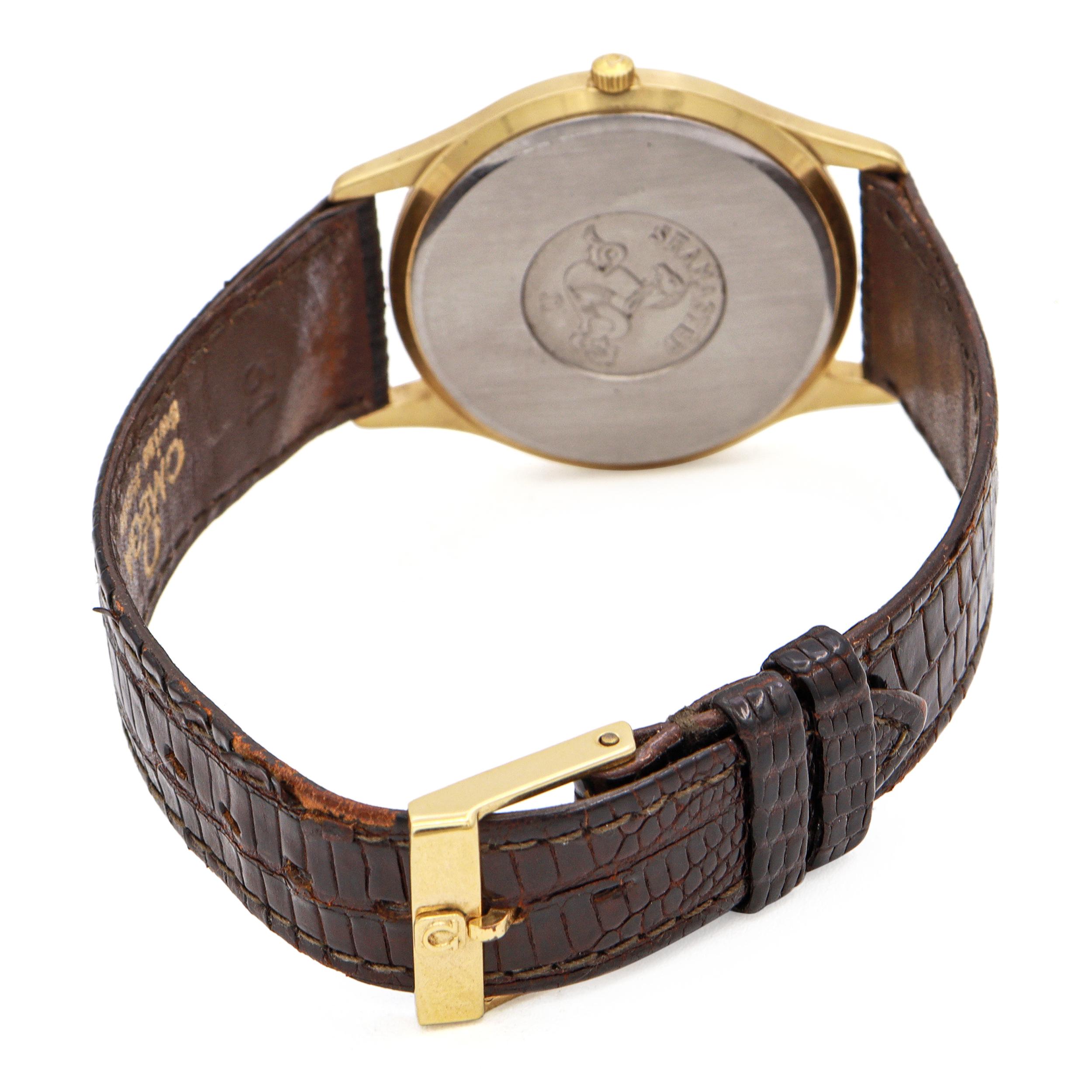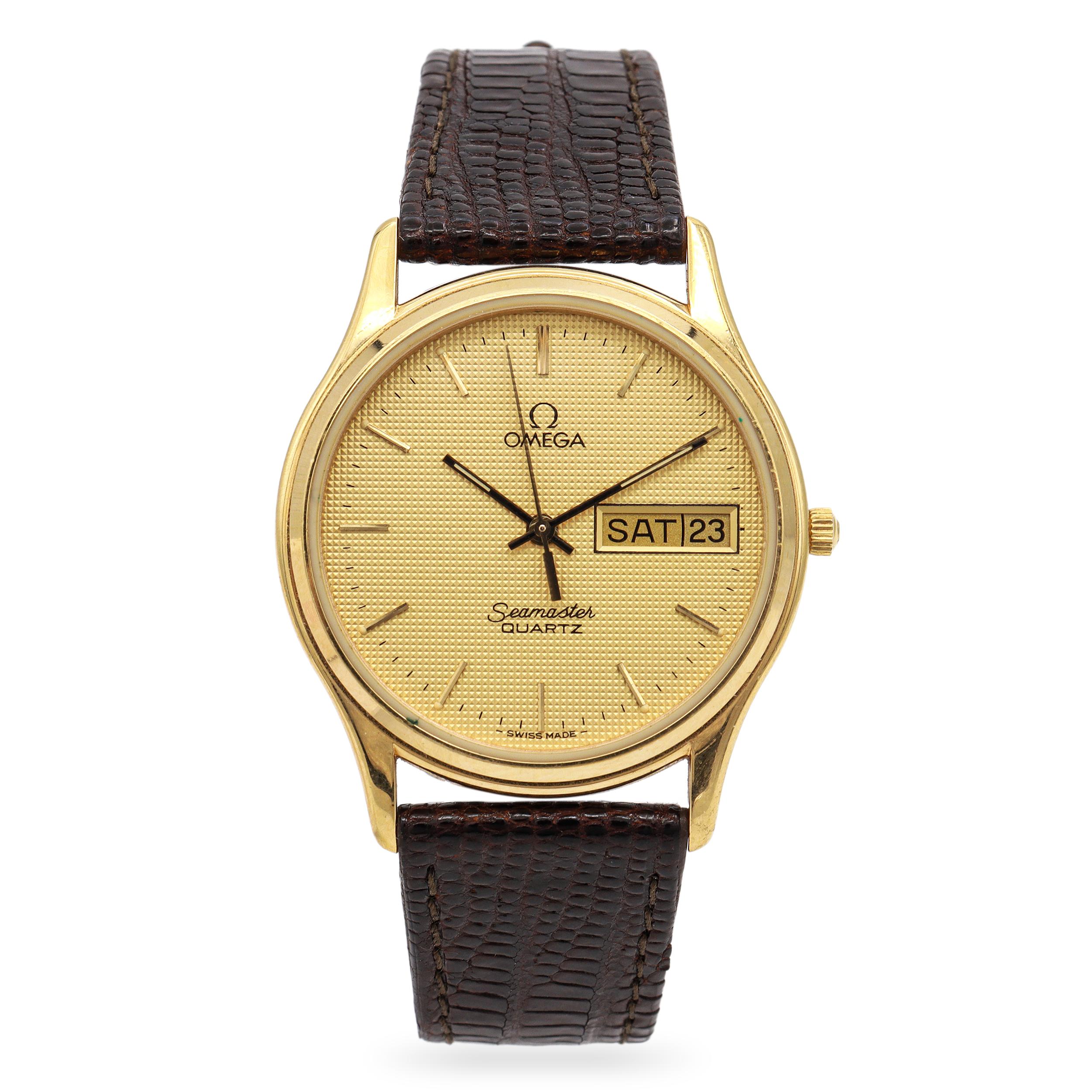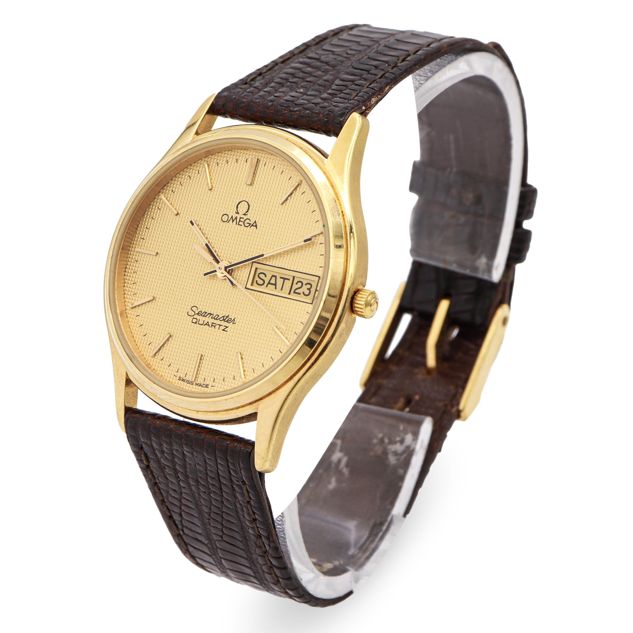 Handsome vintage Omega Seamaster Quartz men’s watch featuring a gold-plated case and a textured champagne dial with matching gold-tone hands and markers. The design includes a day-date window at 3 o’clock and classic Seamaster branding. The caseback displays the engraved Omega Seamaster emblem, and the watch is fitted with a brown lizard-grain leather strap and Omega buckle. A timeless and elegant Omega dress watch with clean lines and iconic styling, showing light vintage wear consistent with age.