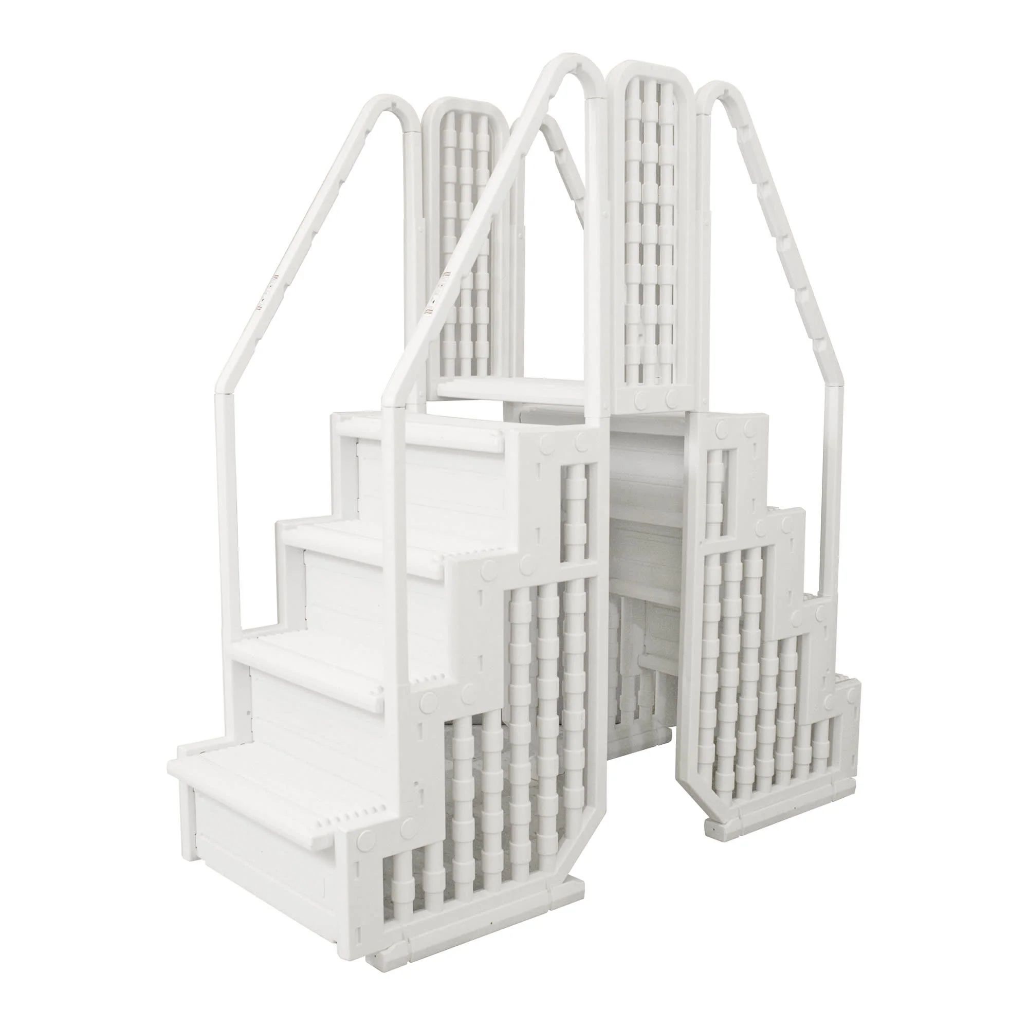 The Easy Pool Step Entry System with Gate combines two full sets of steps to make getting in and out of your above-ground pool safe and easy. Made from non-corroding vinyl, this 4-step entry system is easy on the legs and its gradual incline means almost anyone can now use the pool. The solid dual handrails and non-skid steps ensure trouble-free use. Designed to fit either 48-in to 54-in steel-walled pools, this system features a platform bridge that protects the top rail of your pool. A self-closing, self-latching gate is lockable for added pool security. Meets all local codes for ladder enclosures and pool entry systems. The entry system supports up to 350-lbs.