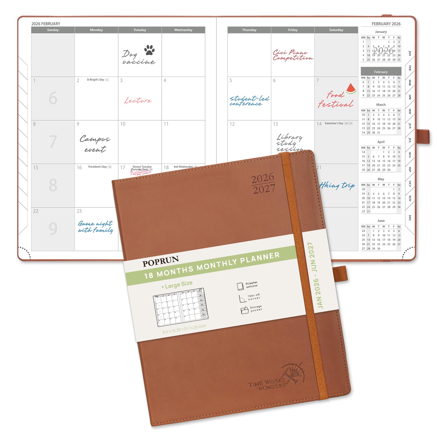POPRUN Monthly Planner 2026-2027 (Large- 8.5" x 10.5" Soft Cover), 18-Month Calendar Book (Jan.2026 - Jun. 2027), Calendar Planner with Monthly Tabs & Pocket, 100 GSM Paper - Brown