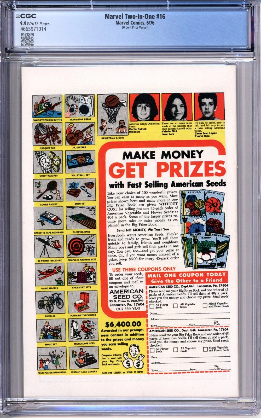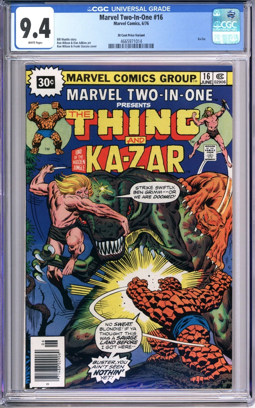 Up for sale is a copy of Marvel Two-In-One #16 graded 9.4 NM with white pages by CGC. This is a rare 30 cent price variant. This will be packaged securely between thick sheets of cardboard and bubble wrap and shipped in a box via USPS priority mail. I do combine shipping on multiple items; feel free to email with any questions.