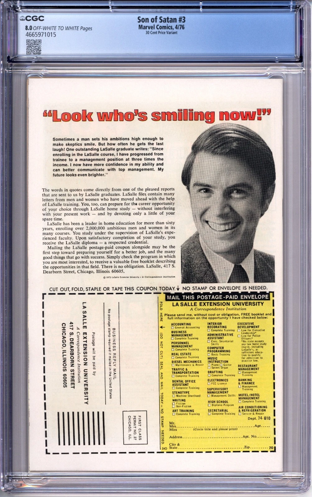 Up for sale is a copy of Son of Satan #3 graded 8.0 VF with off-white to white pages by CGC. This is a rare 30 cent price variant. This will be packaged securely between thick sheets of cardboard and bubble wrap and shipped in a box via USPS priority mail. I do combine shipping on multiple items; feel free to email with any questions.