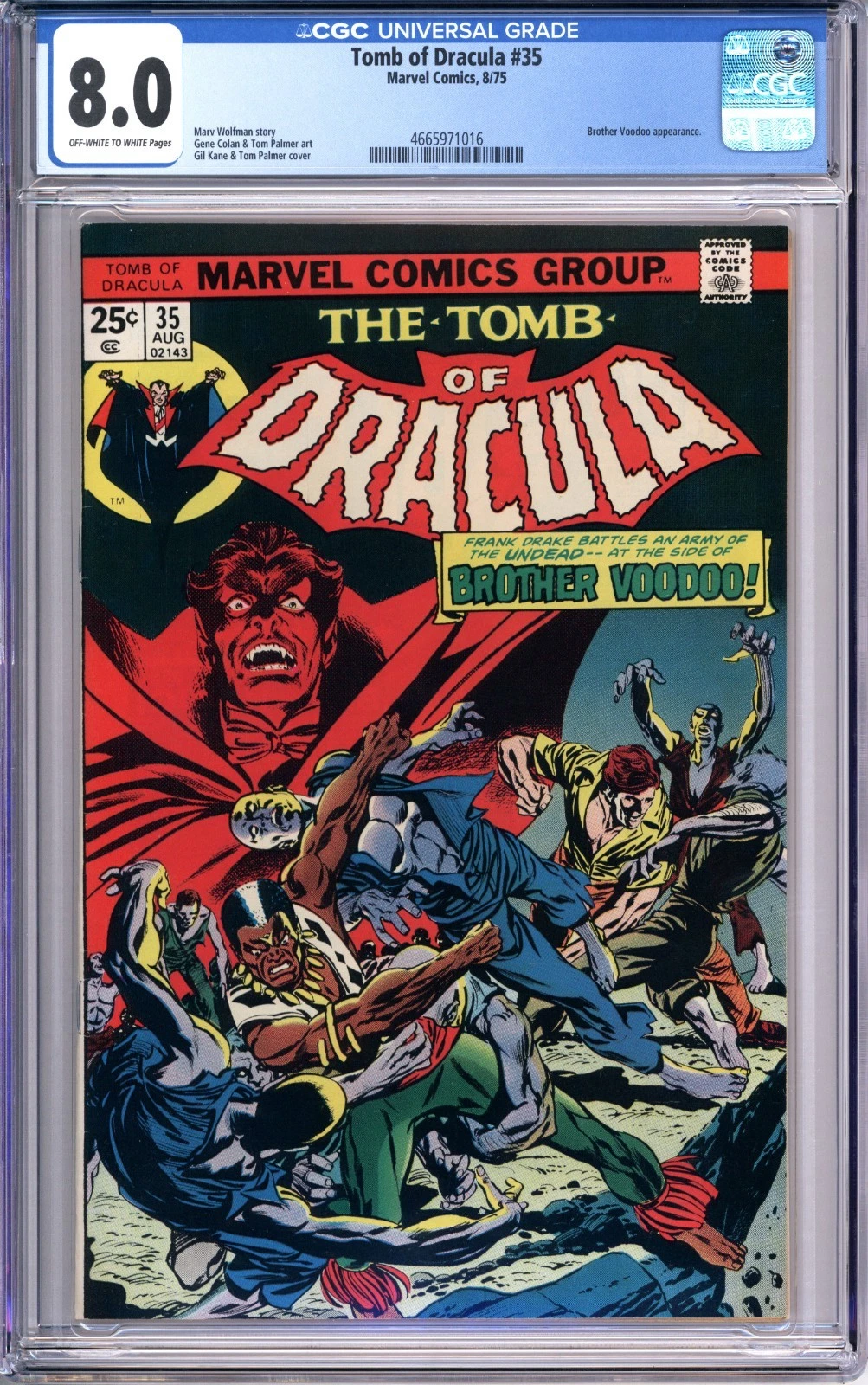 Up for sale is a copy of Tomb of Dracula #35 graded 8.0 VF with off-white to white pages by CGC. This will be packaged securely between thick sheets of cardboard and bubble wrap and shipped in a box via USPS priority mail. I do combine shipping on multiple items; feel free to email with any questions.
