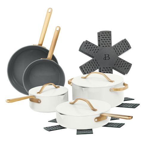 The Beautiful 12-Piece Ceramic Non-Stick Cookware Set by Made by Gather offers a sophisticated blend of style and performance for everyday cooking needs. Crafted with EverGood™ Ceramic Nonstick Coating, this cookware is free from PFAS, PFOA, PTFE, lead, and cadmium, ensuring a safer cooking surface. The set includes an 8" fry pan, 10" fry pan, 3qt covered sauté pan, 2qt covered saucepan, 5qt covered casserole pan, and four cookware protectors. Each pot and pan features integrated pour spouts and aluminum lids with built-in strainers to minimize spills and simplify draining. Designed for versatility, the cookware is oven safe up to 500°F including the lids and compatible with all stovetops such as induction. The aluminum construction promotes fast and even heating for consistent cooking results. Finished in a sleek white icing color with elegant gold handles, this set adds a touch of luxury to your kitchen. While dishwasher safe for convenience, hand washing is recommended to maintain the nonstick coating’s longevity. This comprehensive set is perfect for those seeking durable, stylish cookware that performs well across various cooking tasks.
