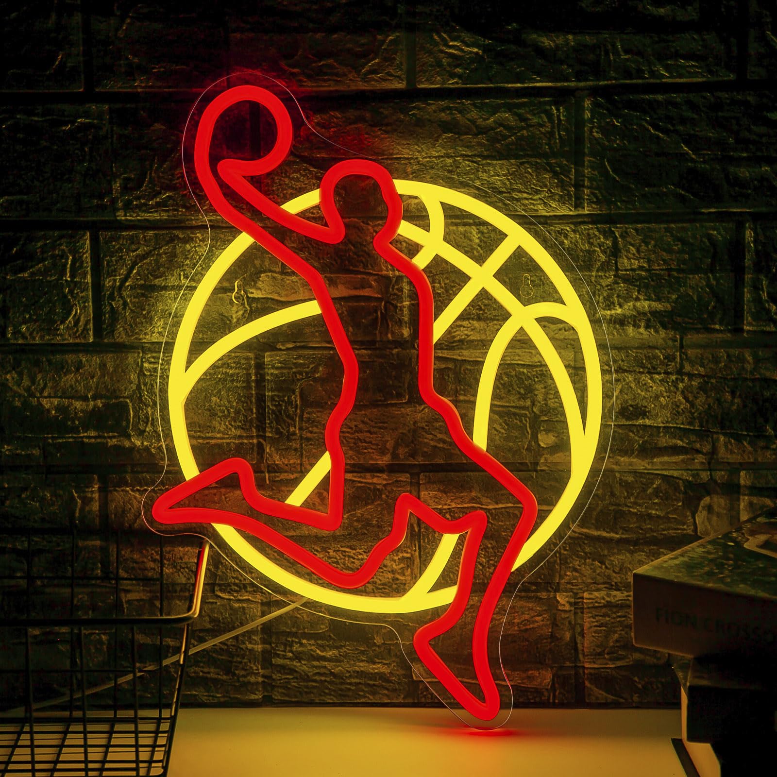 Light up your space with this basketball-themed neon sign, featuring a red silhouette of a slam-dunking player and a vibrant orange basketball. Measuring 15.9 × 11.53 inches, this LED wall light makes a bold statement in any teen bedroom, gamer corner, or man cave.
