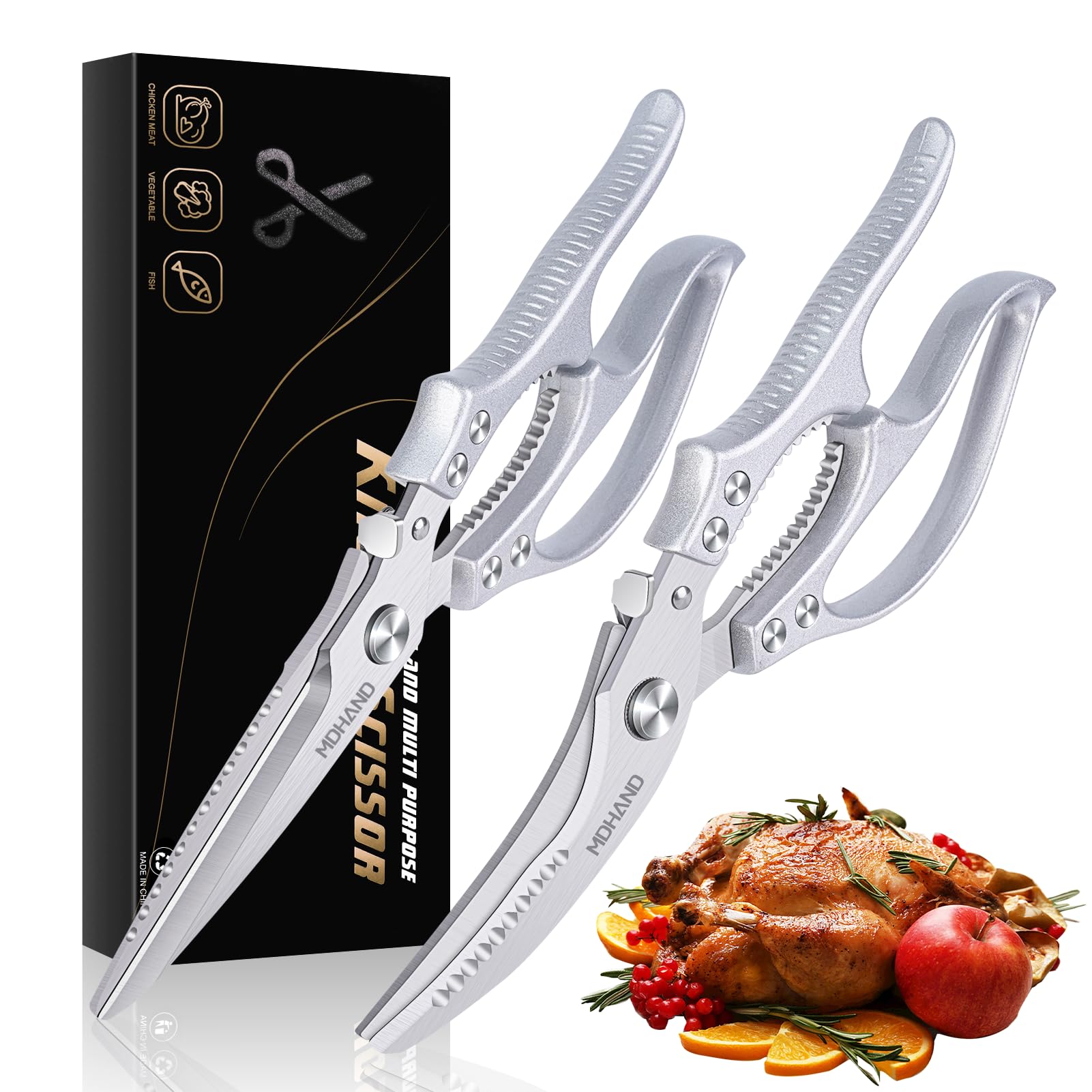 Heavy-Duty Poultry Scissors: Made from high-grade stainless steel, these kitchen shears set resist rust, stay sharp, and endure heavy use. Their 0.66-inch (16.76mm) blade is exceptionally thick, offering unmatched strength compared to ordinary scissors. Micro-serrated edges also provide a non-slip cutting for all kinds of food.