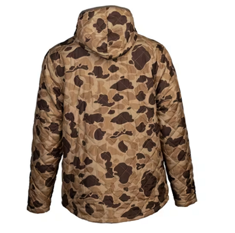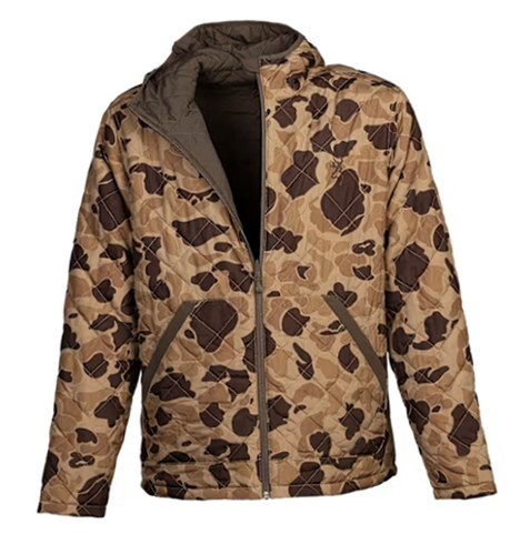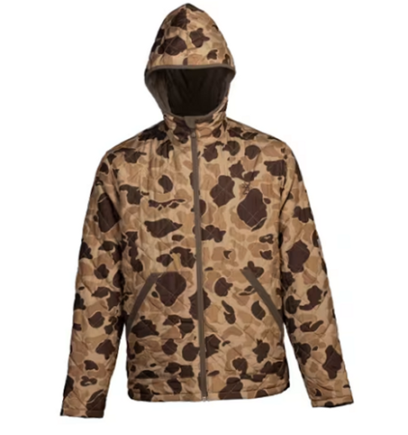 Designed for adaptability and comfort, the Browning Lightweight Reversible Camp Jacket for Men features a unique reversible design with a camo pattern on one side and a solid vintage tan color on the other. Constructed from durable 20-denier polyester micro-ripstop fabric, this jacket naturally resists water to help keep you dry during damp weather. The quilted 80-gram synthetic insulation provides lightweight warmth without adding bulk, making it ideal for layering or wearing alone in cooler conditions. An insulated reversible hood offers additional protection against the elements, while two hand pockets on each side of the jacket provide convenient storage and easy access regardless of which side is worn. This jacket combines practical features with stylish versatility to meet outdoor and casual wear needs.